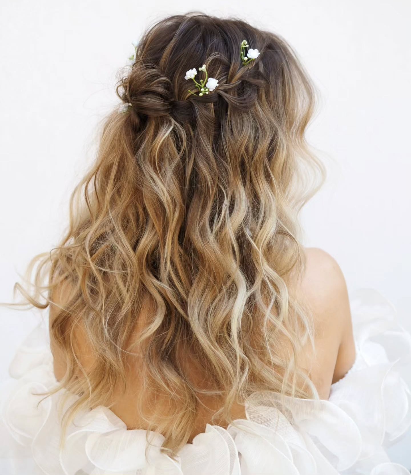 The choice of the right wedding hairstyle is as important as the choice of a wedding dress. If you can’t decide between an updo and a downdo, consider the variety of half-up, half-down bridal hairstyles. This way you’ll enjoy the best qualities of both hairstyle groups – the naturalness and chic of freely flowing locks and the elegance of the lifted up part. This edit spotlights contemporary natural textures alongside romantic styles with braided details and veils.