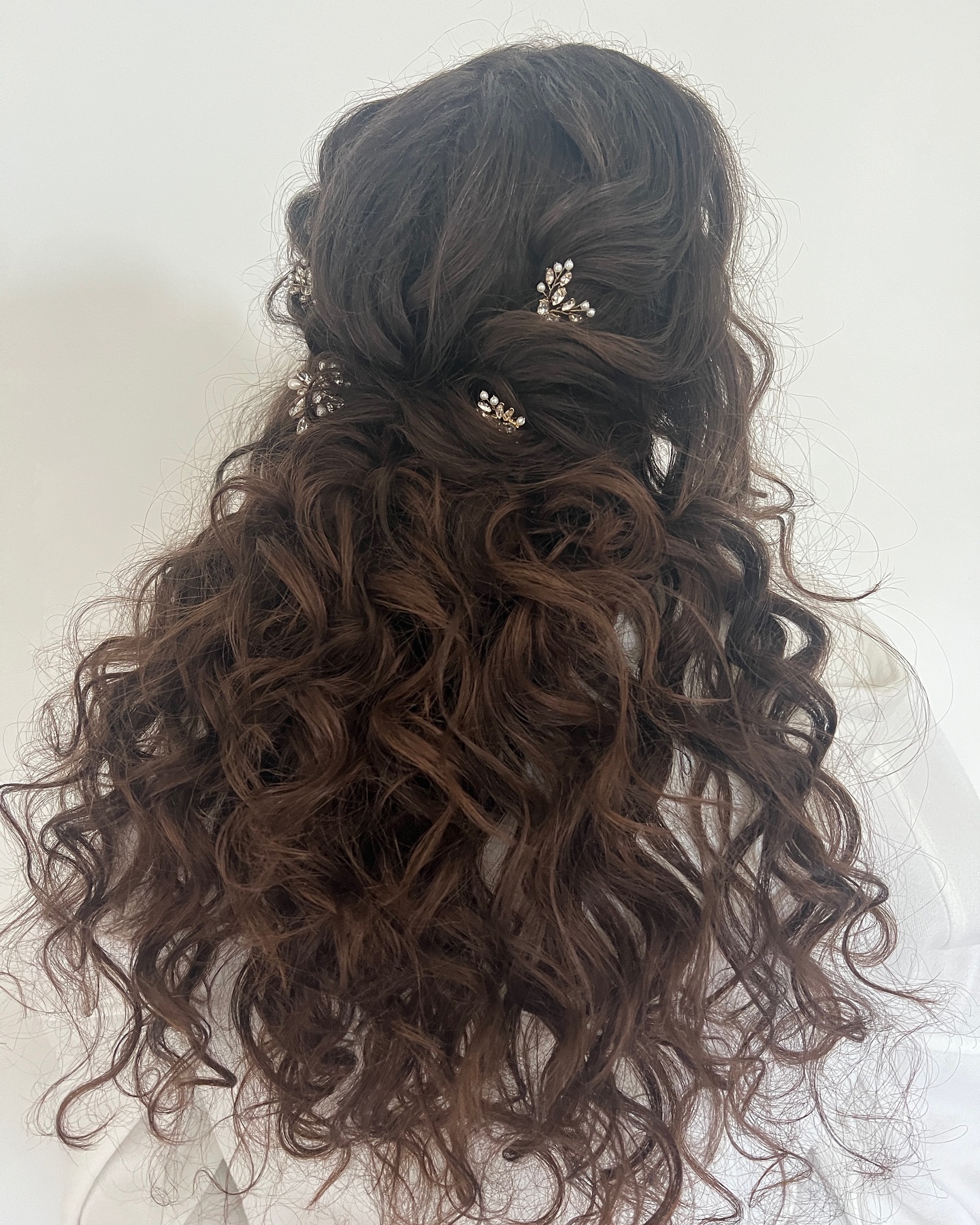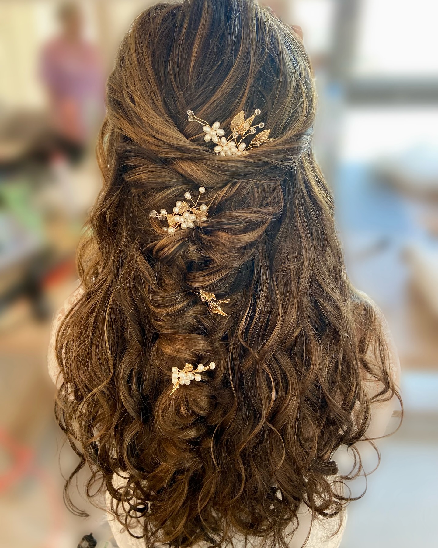 This is one of those highly requested half-up, half-down bridal hairstyles for a straight-haired woman who wants to be all curls on her wedding day. Hair is curled and pulled back halfway, which makes for the perfect location to add an interesting wedding comb or tiara.