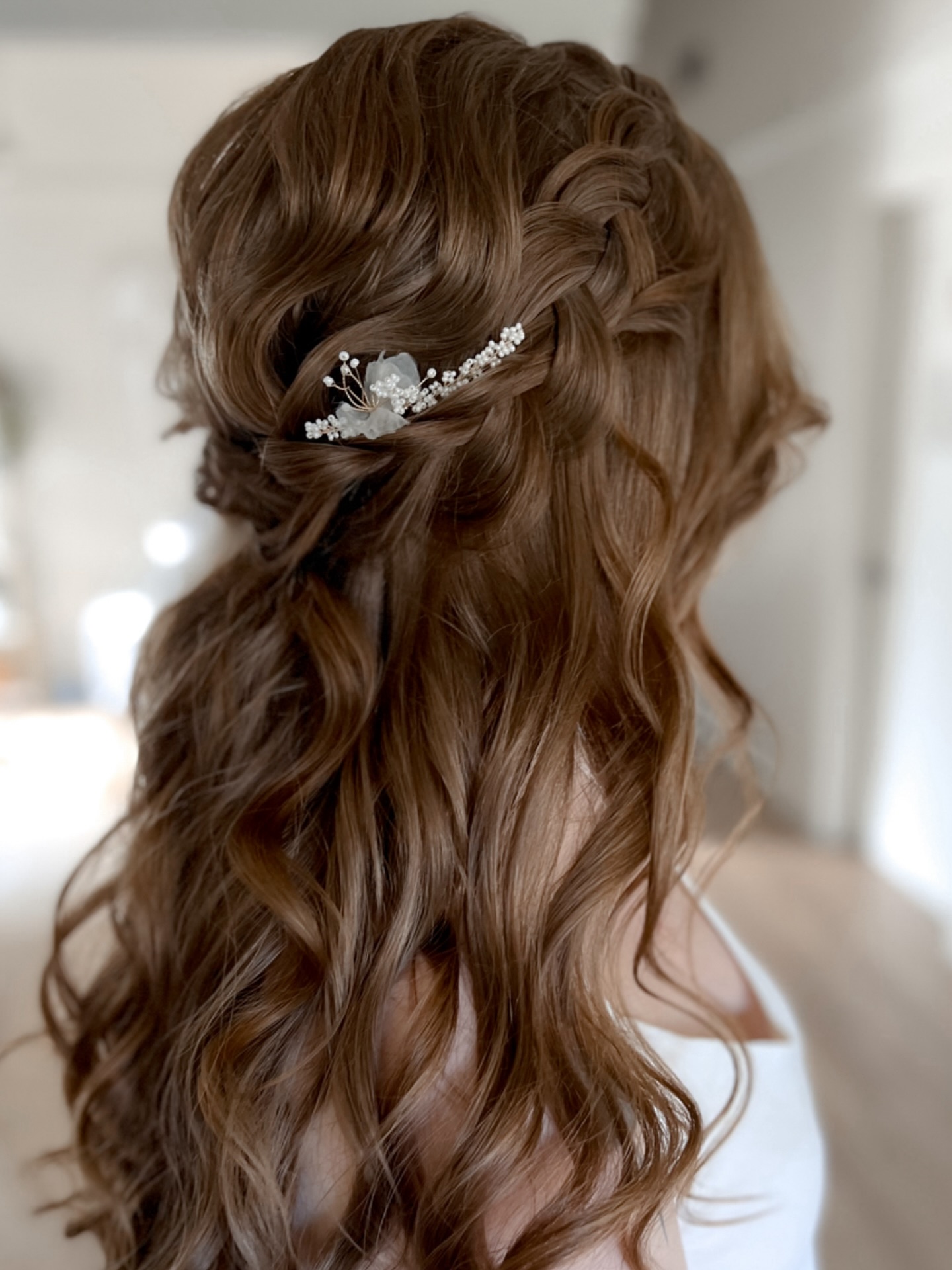Two braids – one thick, one thin – are placed across the crown of the head, while the front pieces are tucked back and secured in the back with a small sprinkle of flowers. The rear section is allowed to flow freely down the back.