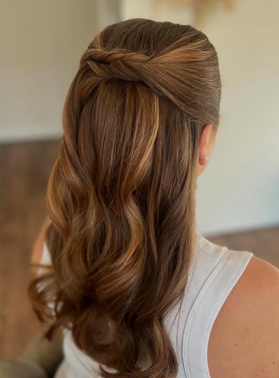 Half up half down is one of the most popular hairstyles for a reason. Less formal than a full updo, it’s more special than simple curls. Half up styles are easy to wear and are incredibly flattering and feminine.”