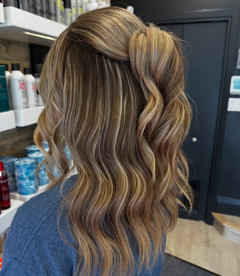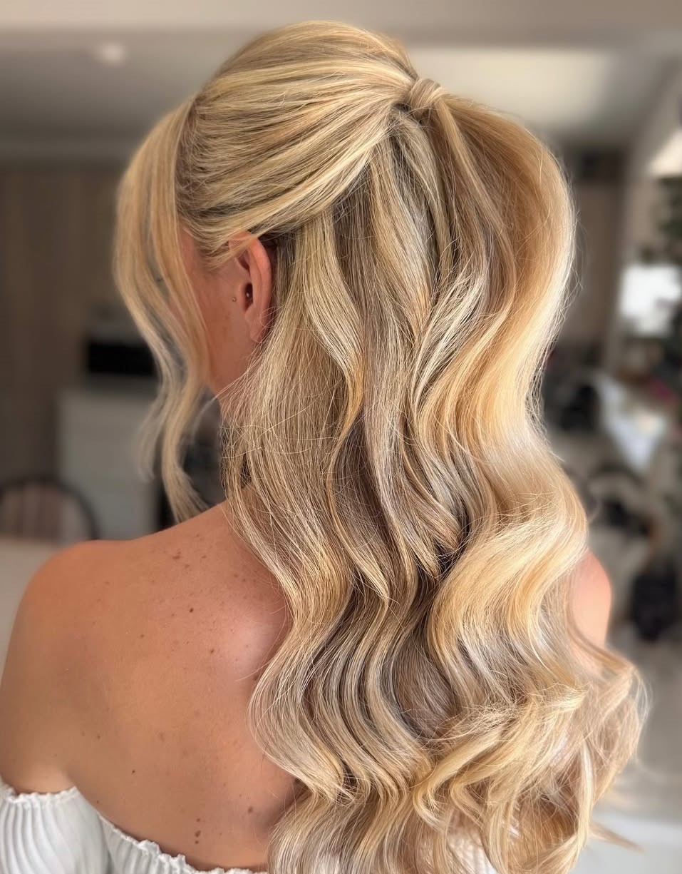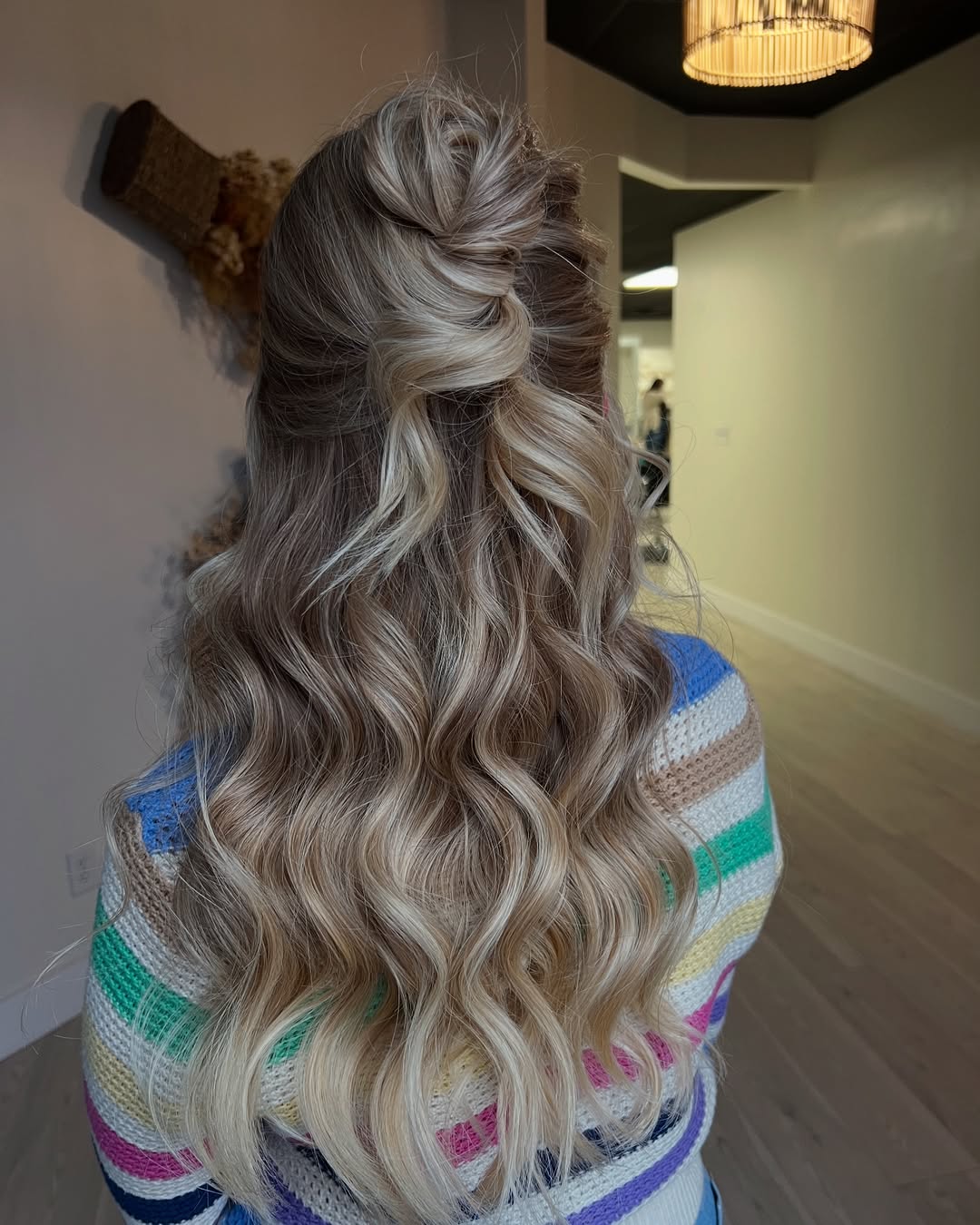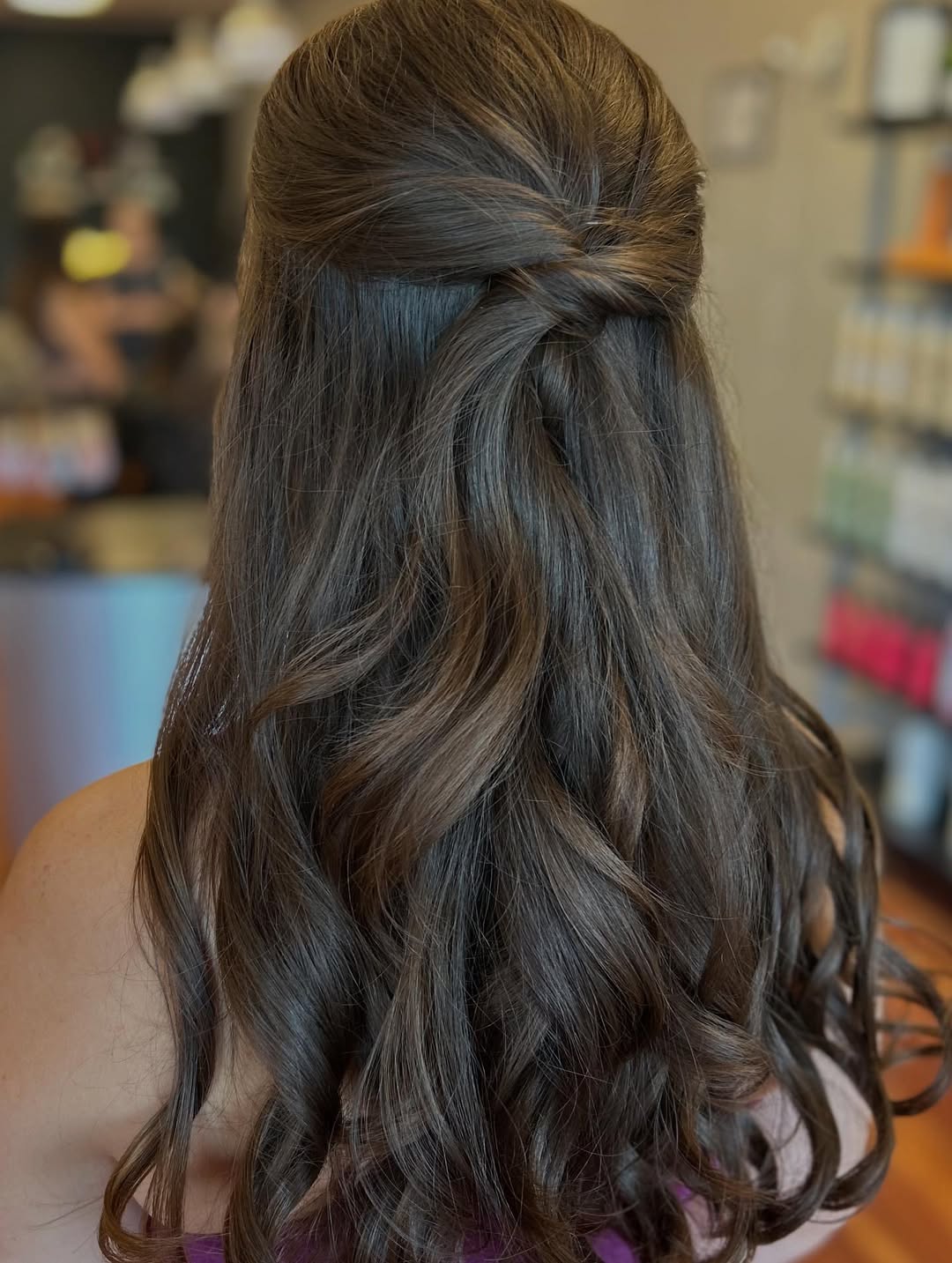 Half up half down is one of the most popular hairstyles for a reason. Less formal than a full updo, it’s more special than simple curls. Half up styles are easy to wear and are incredibly flattering and feminine.”