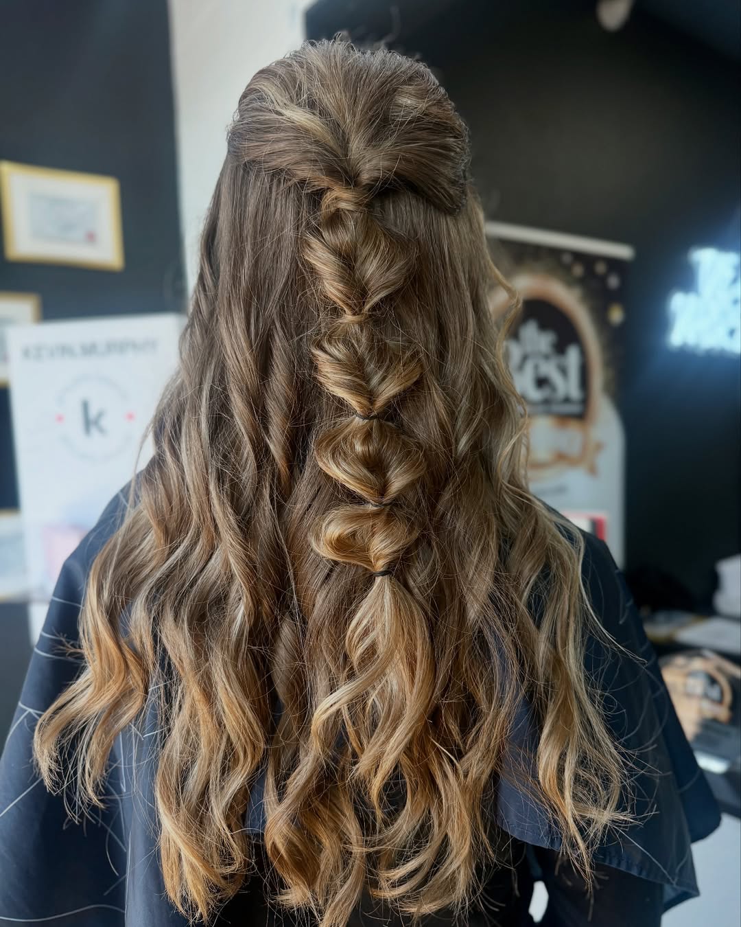 If you’re looking for a fancy yet easy upgrade to your half-updo, try pulling some hair through the braids joined at the back of your head for a waterfall braid effect. Loose, bouncy curls will help to finish off the look.