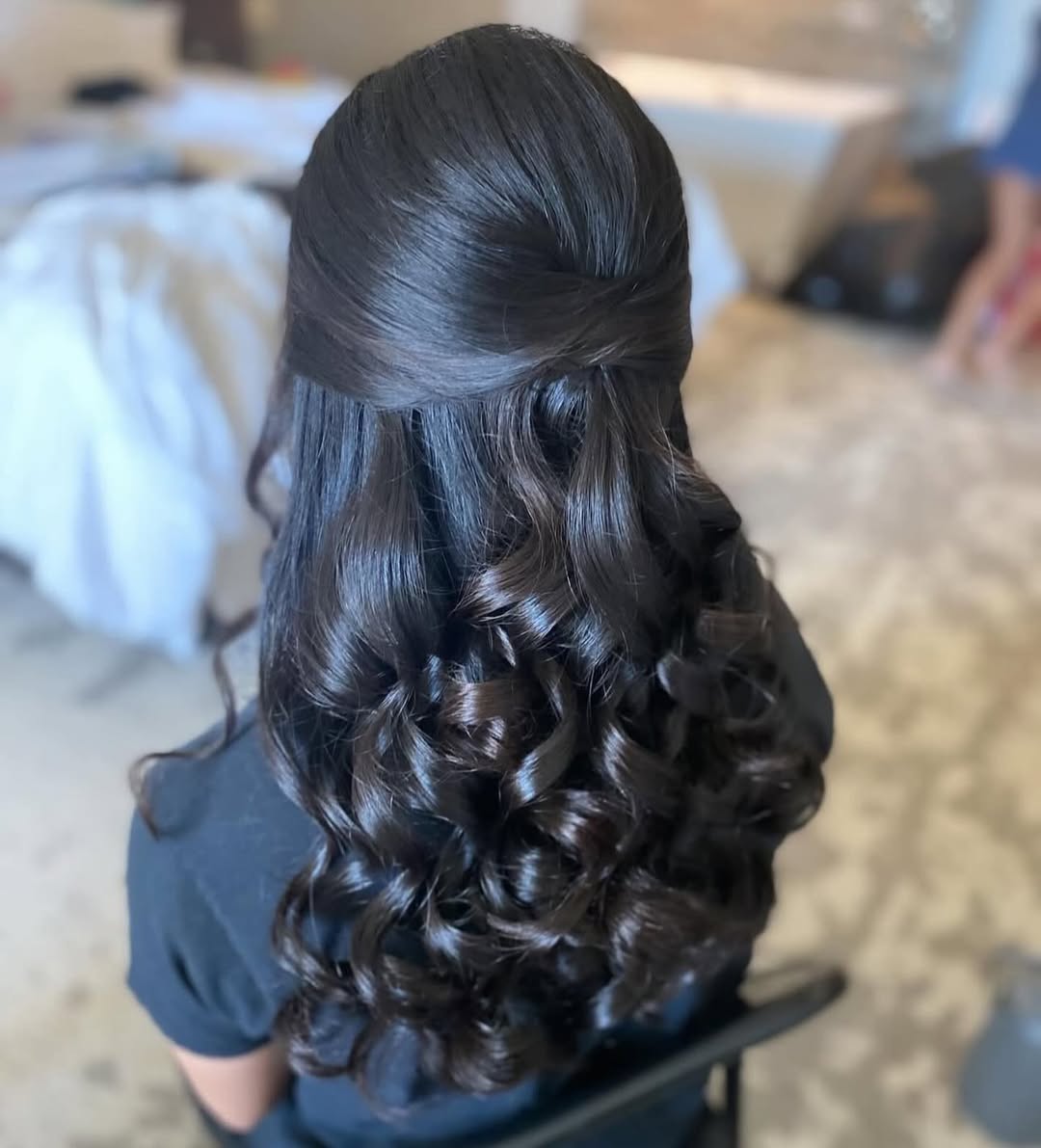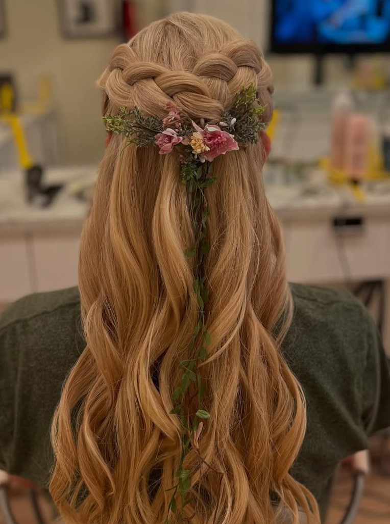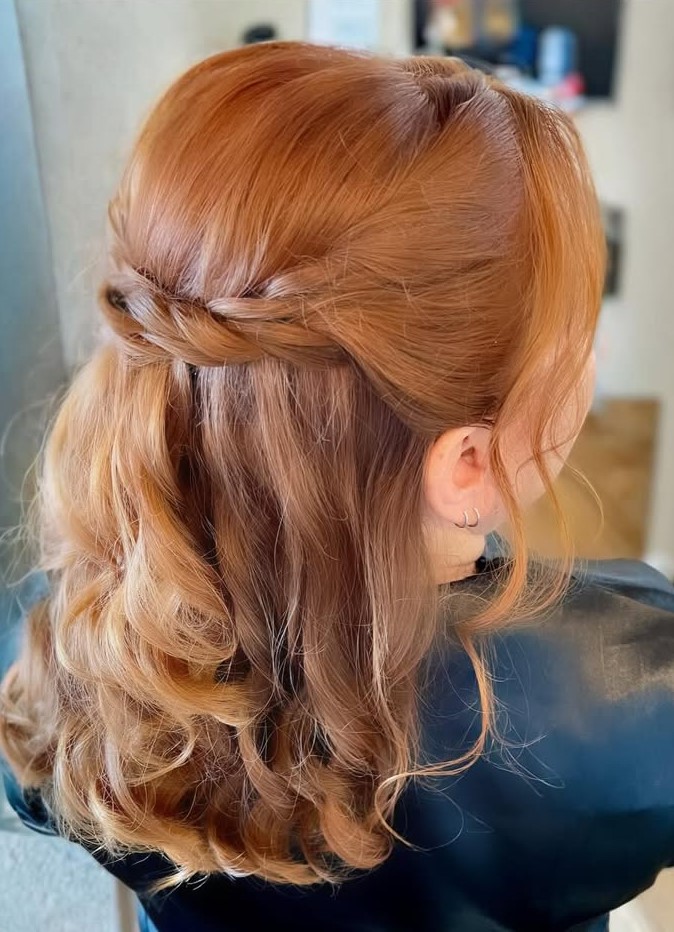Half up half down is one of the most popular hairstyles for a reason. Less formal than a full updo, it’s more special than simple curls. Half up styles are easy to wear and are incredibly flattering and feminine.”