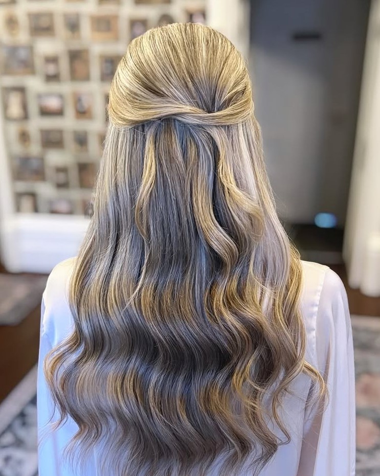Half up half down is one of the most popular hairstyles for a reason. Less formal than a full updo, it’s more special than simple curls. Half up styles are easy to wear and are incredibly flattering and feminine.”