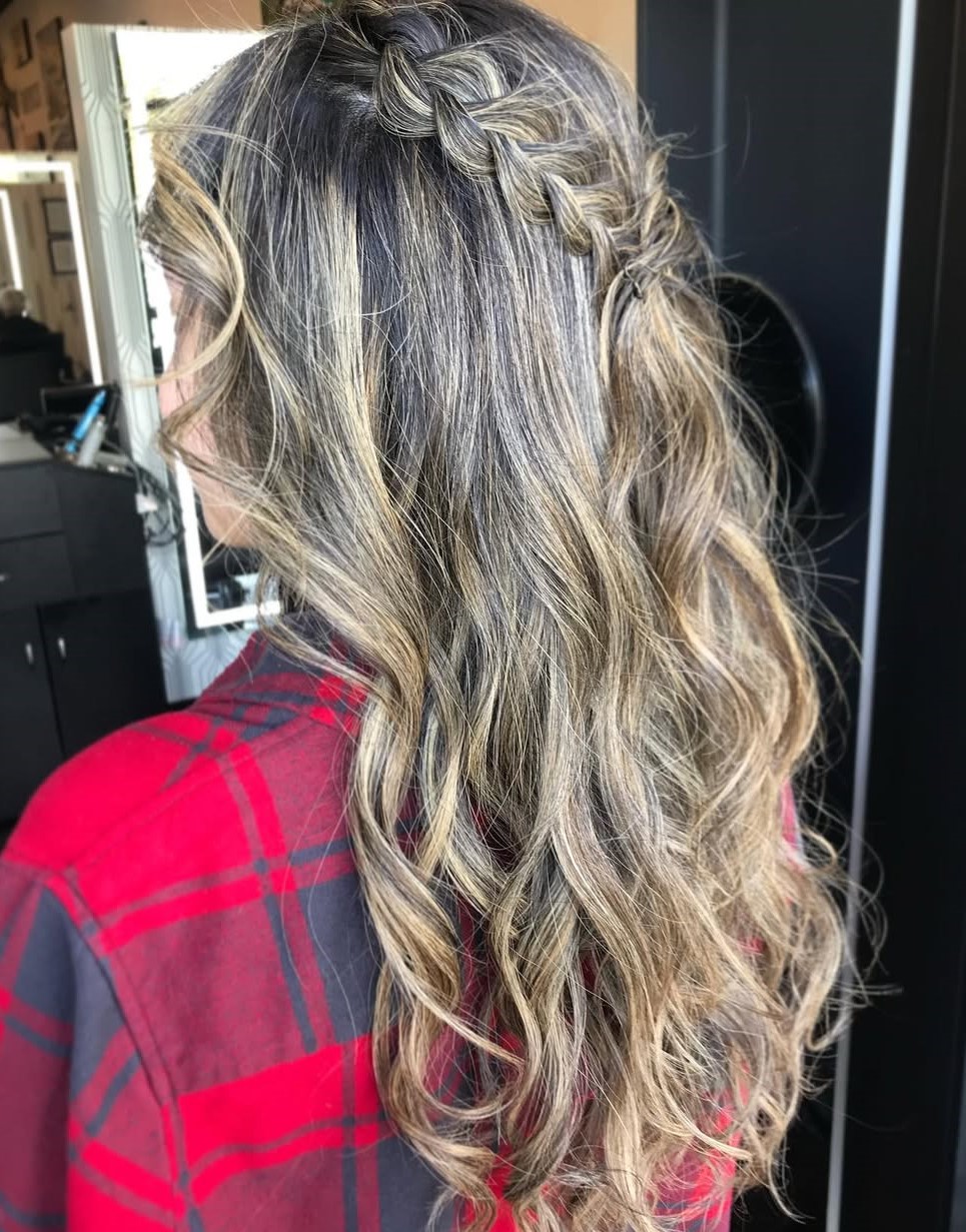 This ‘do is an excellent way to showcase a beautiful balayage. The chunky braid beautifully blends all the hues of the blonde dye job and puts them on display. The whimsical curls with blunt ends pull the look together with a clean finish.