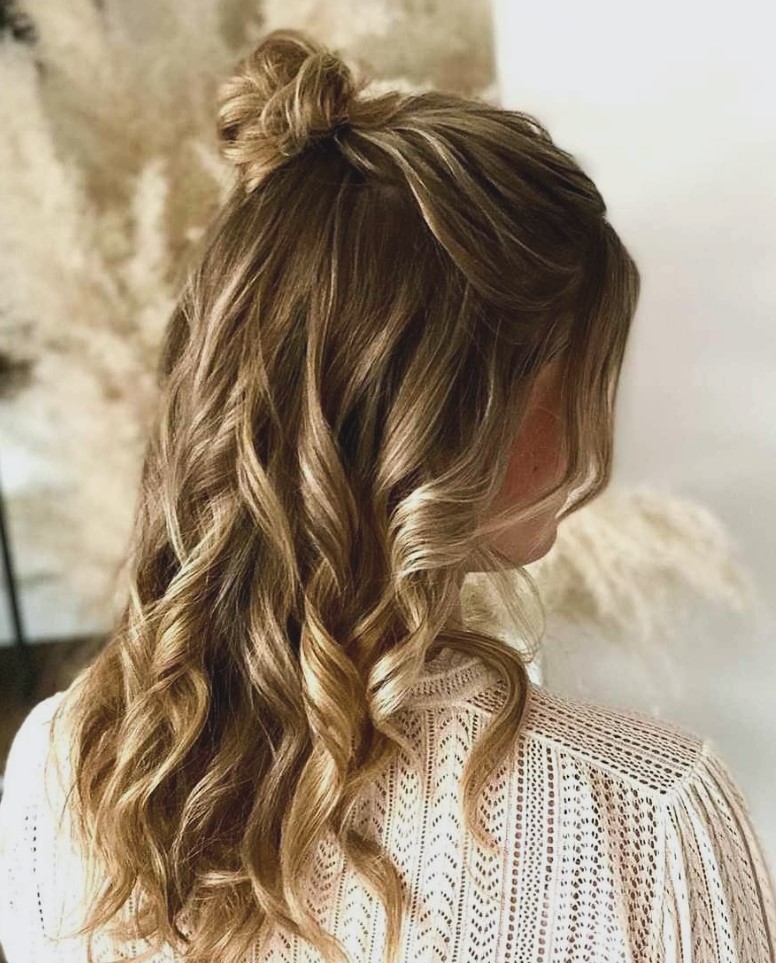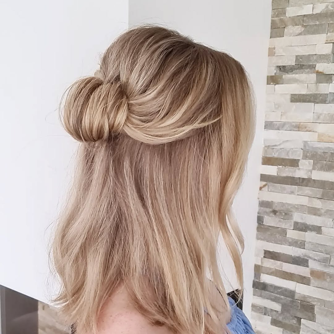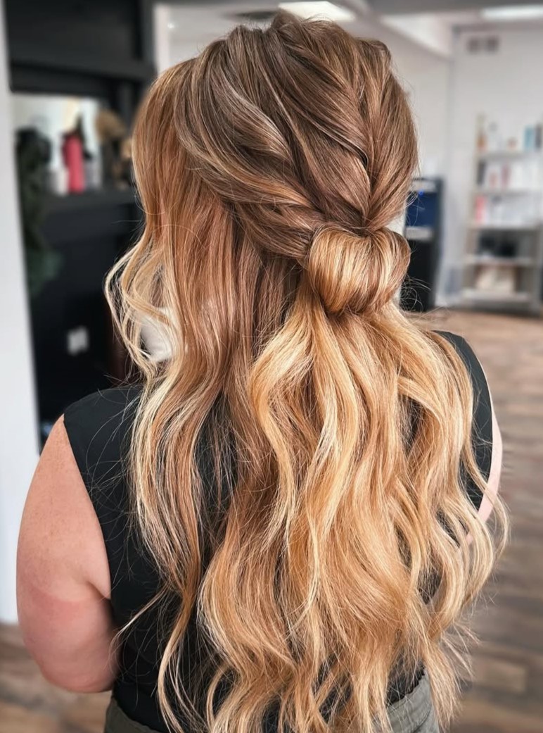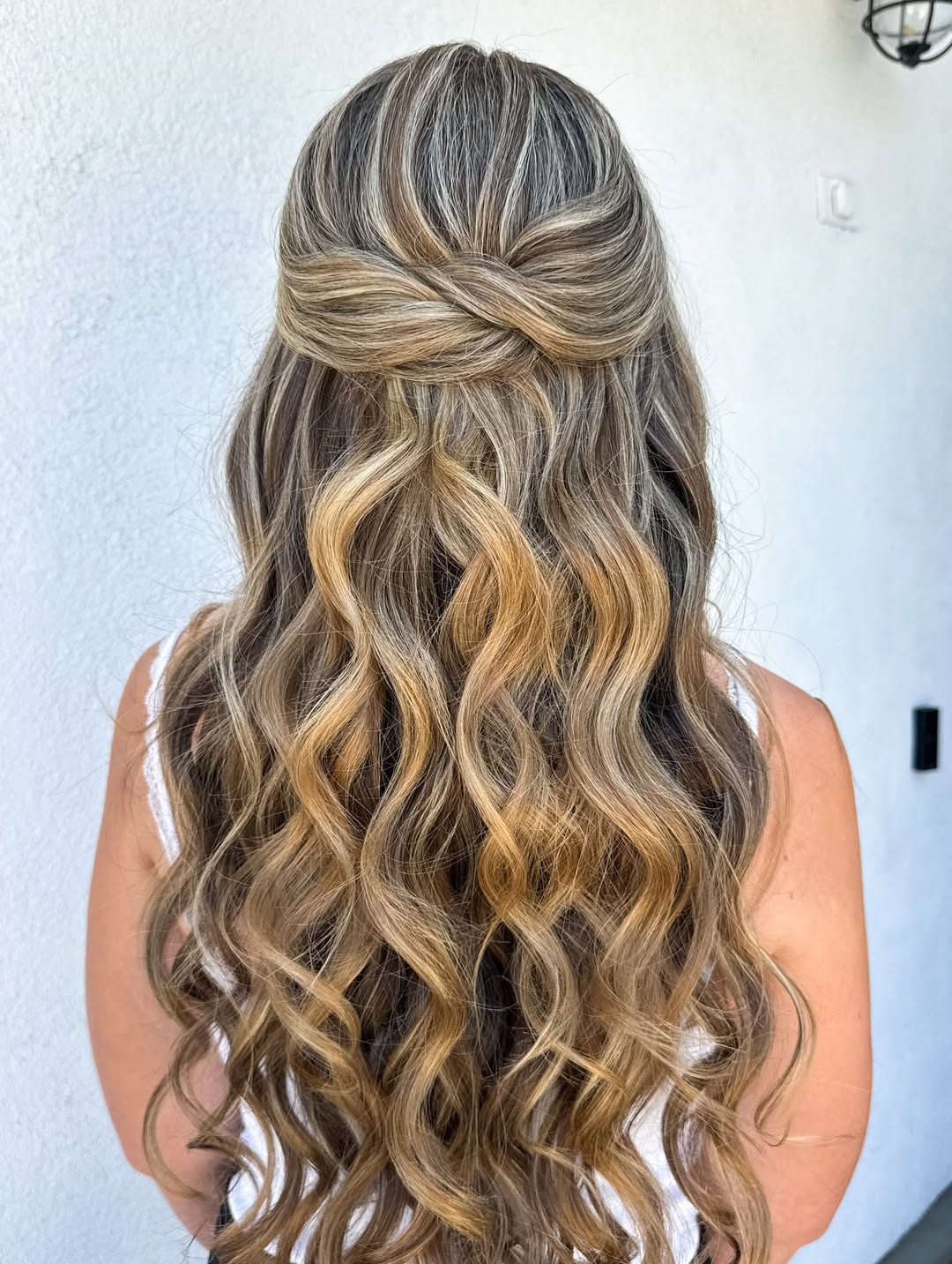 Half up half down is one of the most popular hairstyles for a reason. Less formal than a full updo, it’s more special than simple curls. Half up styles are easy to wear and are incredibly flattering and feminine.”