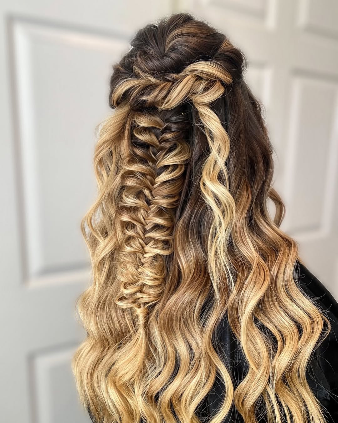 This ‘do is an excellent way to showcase a beautiful balayage. The chunky braid beautifully blends all the hues of the blonde dye job and puts them on display. The whimsical curls with blunt ends pull the look together with a clean finish.