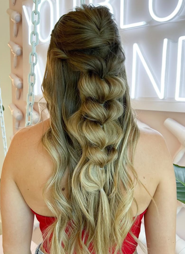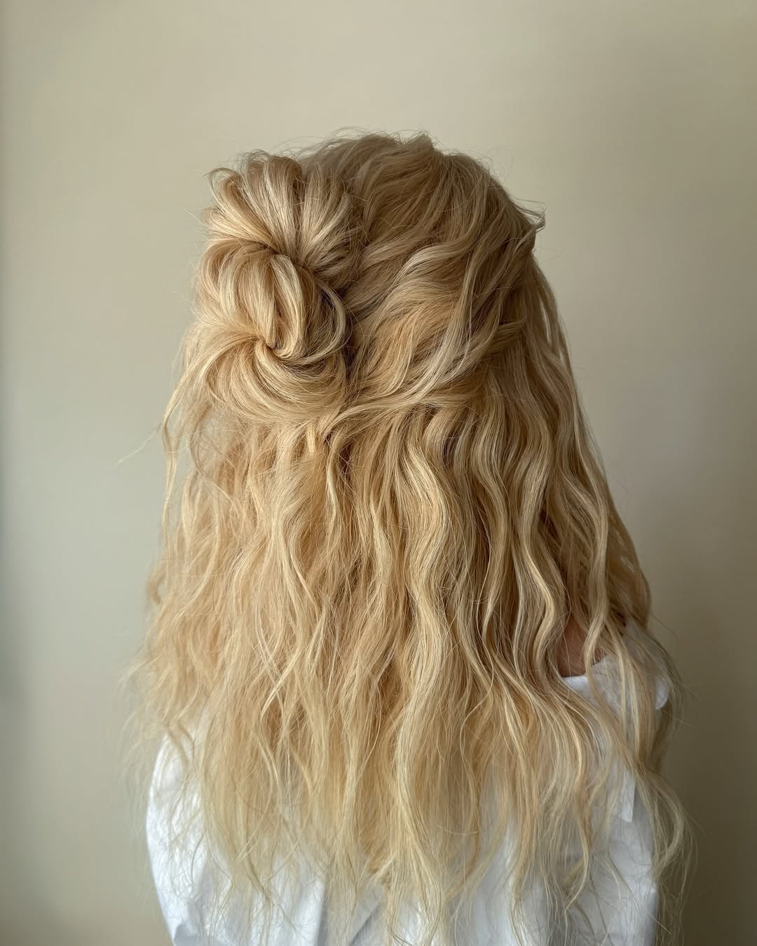 Half up half down is one of the most popular hairstyles for a reason. Less formal than a full updo, it’s more special than simple curls. Half up styles are easy to wear and are incredibly flattering and feminine.”