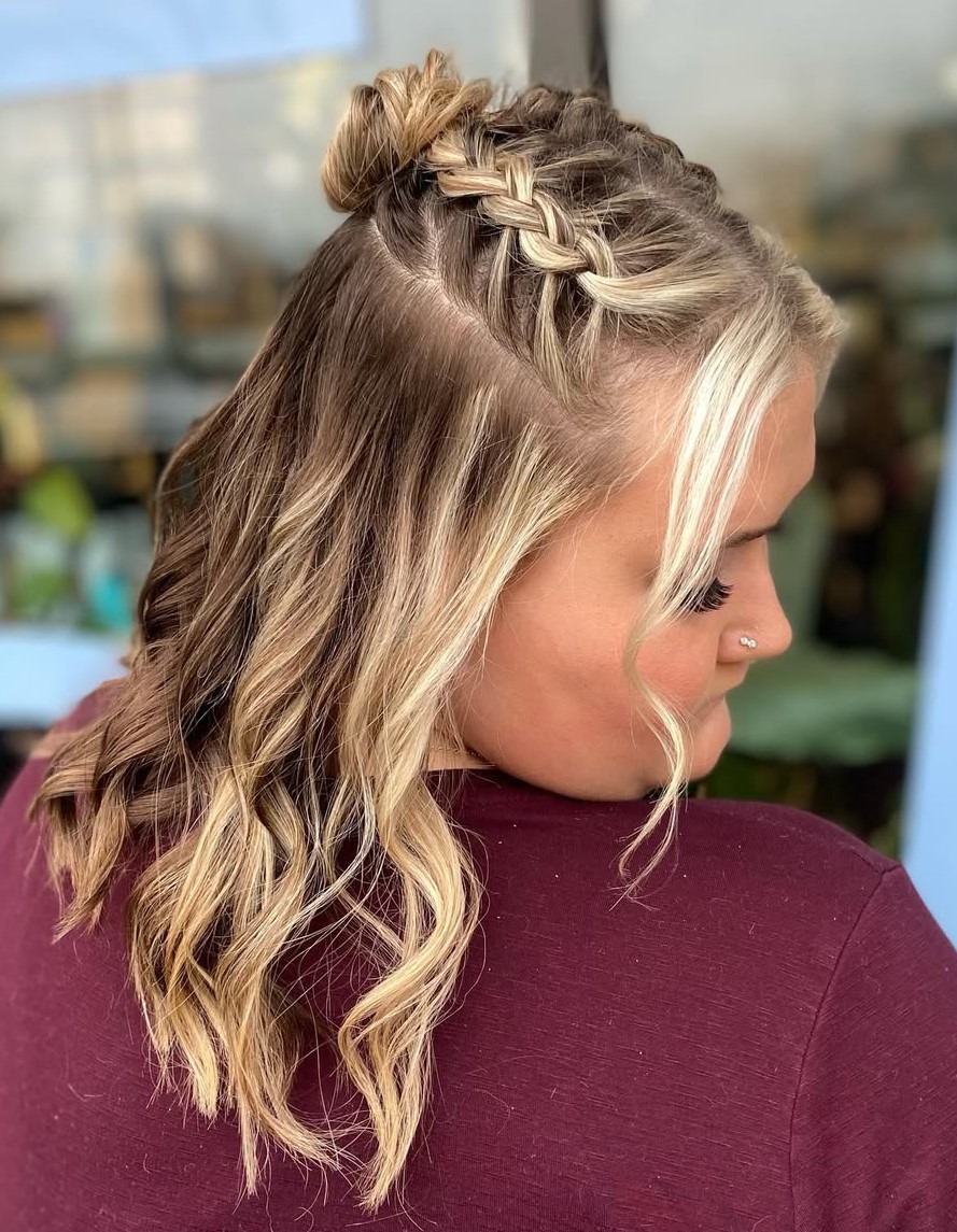 This ‘do is an excellent way to showcase a beautiful balayage. The chunky braid beautifully blends all the hues of the blonde dye job and puts them on display. The whimsical curls with blunt ends pull the look together with a clean finish.