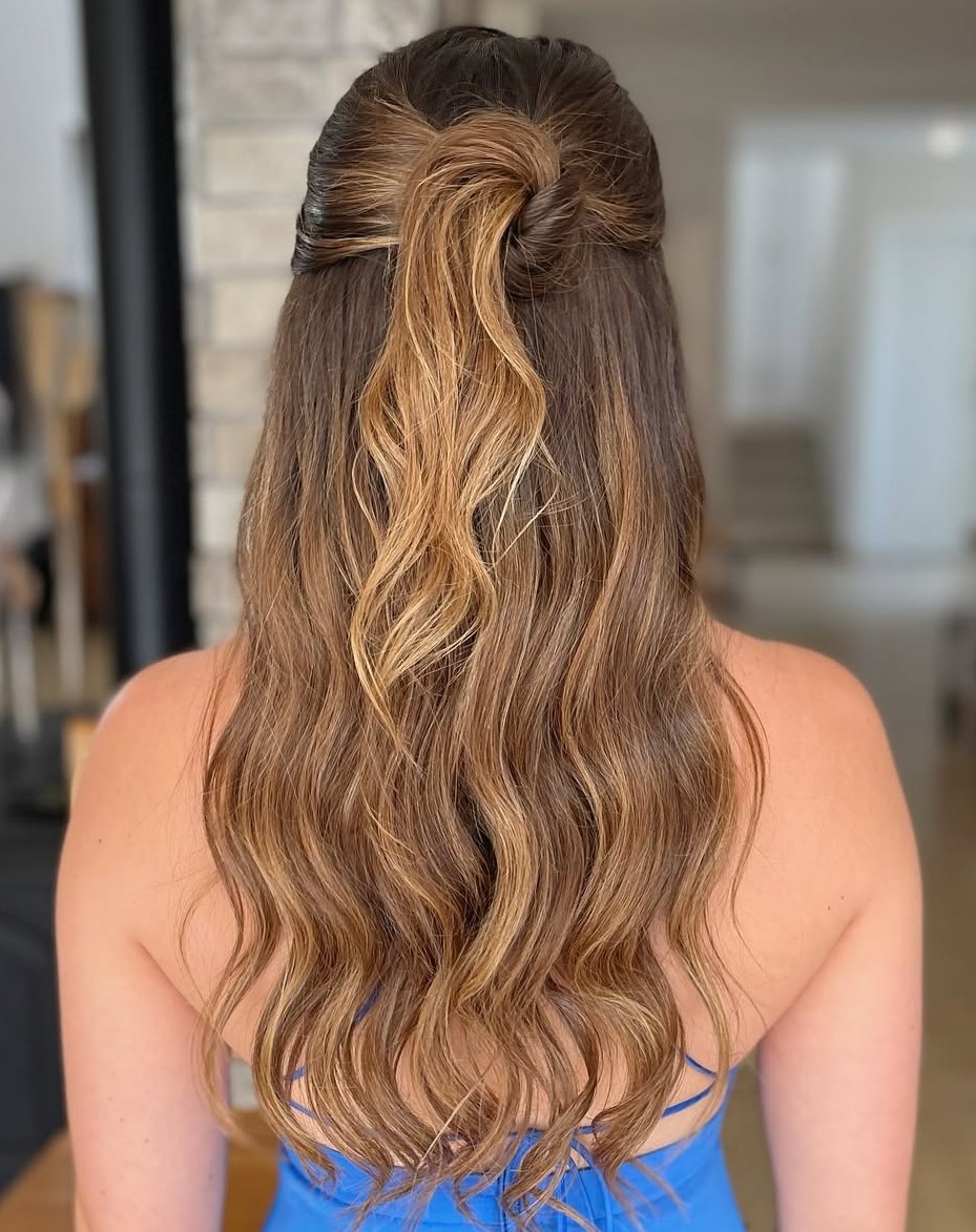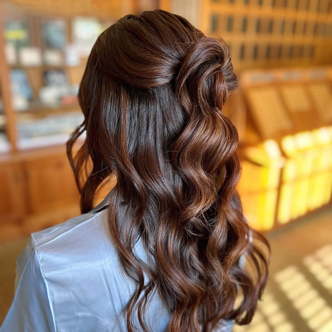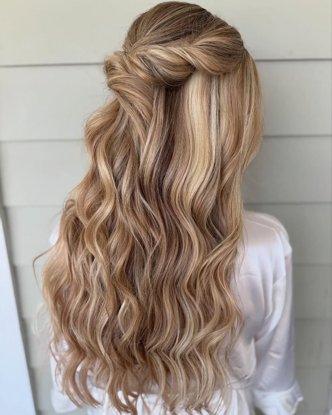 Half up half down is one of the most popular hairstyles for a reason. Less formal than a full updo, it’s more special than simple curls. Half up styles are easy to wear and are incredibly flattering and feminine.”