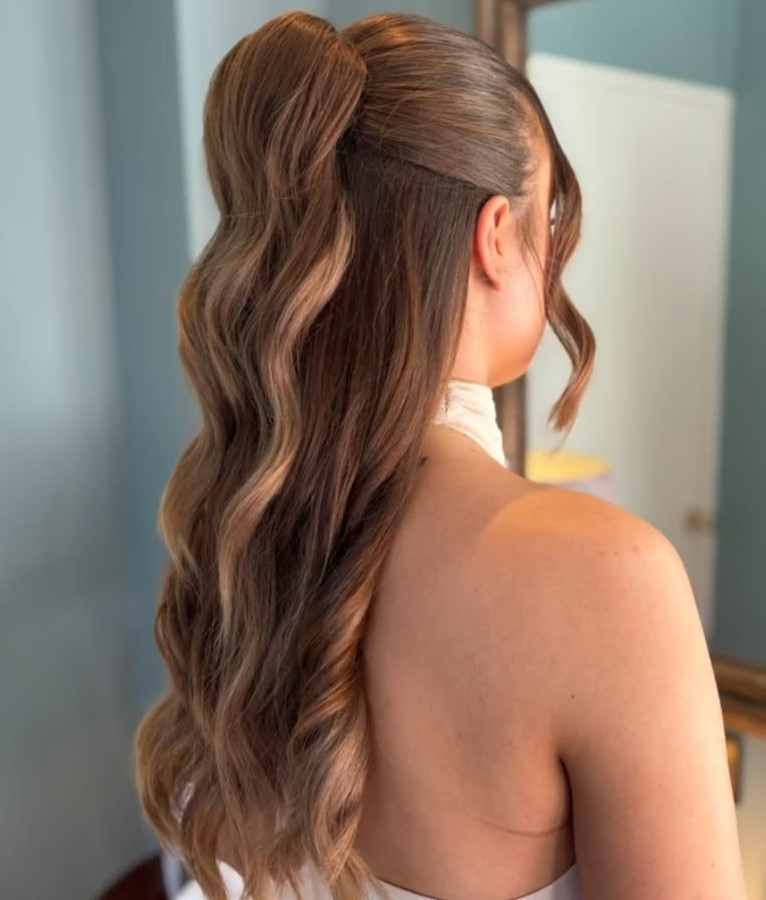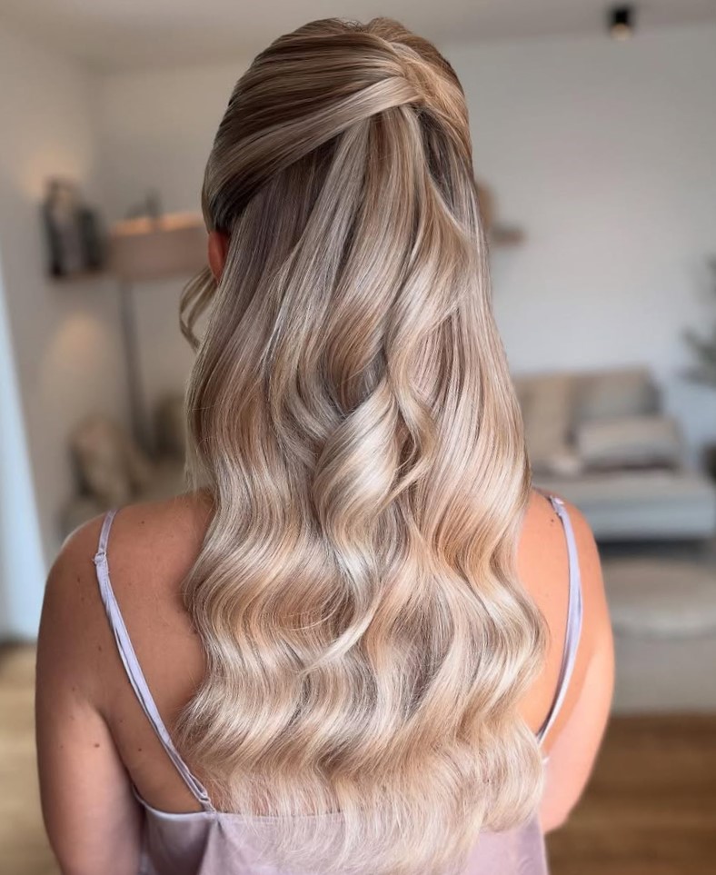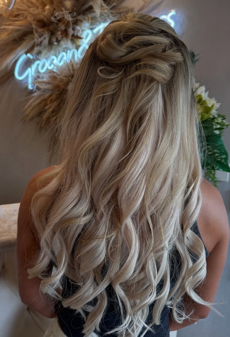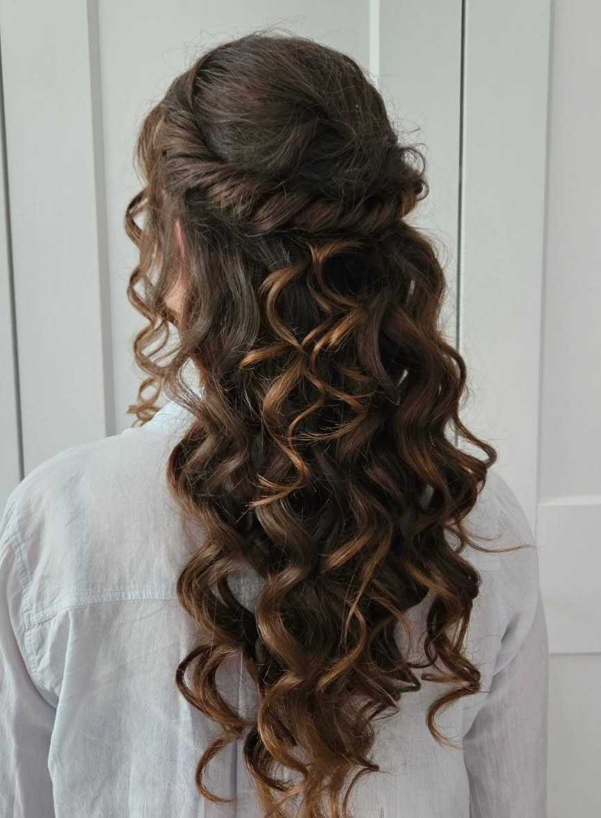 Half up half down is one of the most popular hairstyles for a reason. Less formal than a full updo, it’s more special than simple curls. Half up styles are easy to wear and are incredibly flattering and feminine.”