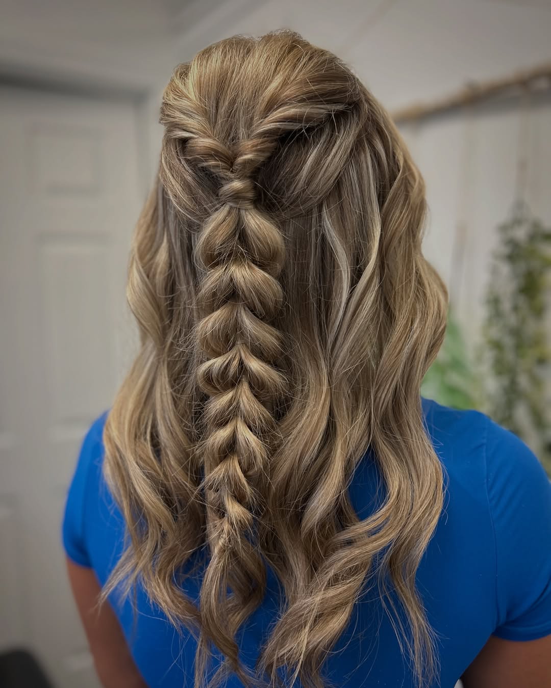 If you’re looking for a fancy yet easy upgrade to your half-updo, try pulling some hair through the braids joined at the back of your head for a waterfall braid effect. Loose, bouncy curls will help to finish off the look.