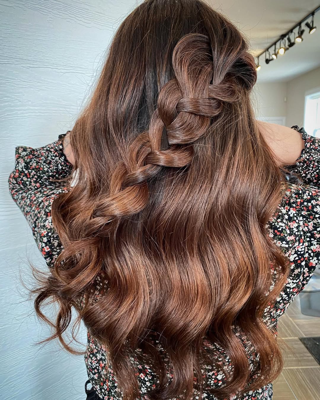 This ‘do is an excellent way to showcase a beautiful balayage. The chunky braid beautifully blends all the hues of the blonde dye job and puts them on display. The whimsical curls with blunt ends pull the look together with a clean finish.