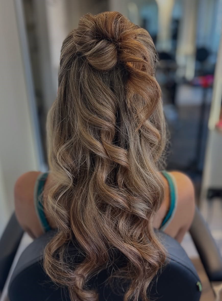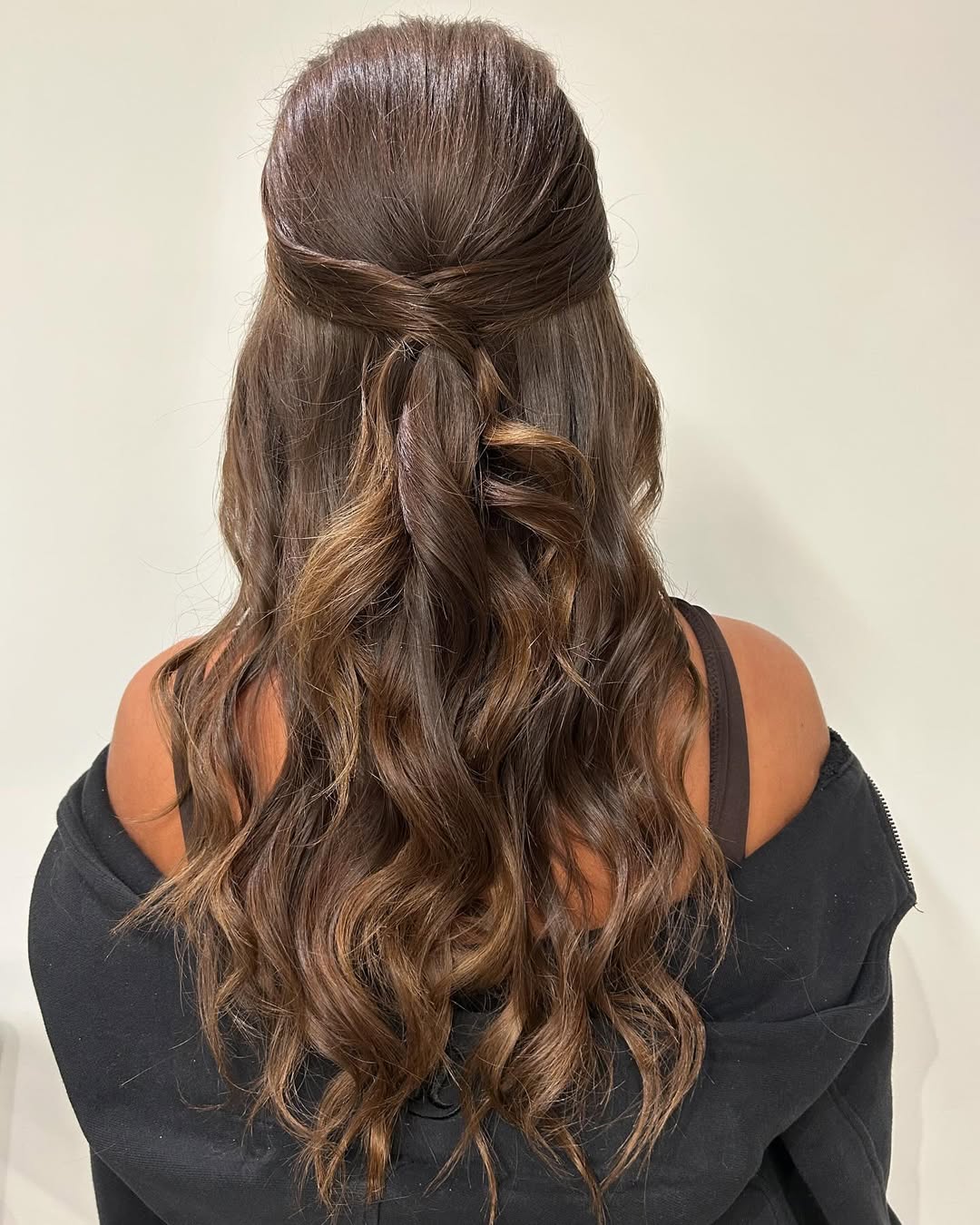 Half up half down is one of the most popular hairstyles for a reason. Less formal than a full updo, it’s more special than simple curls. Half up styles are easy to wear and are incredibly flattering and feminine.”