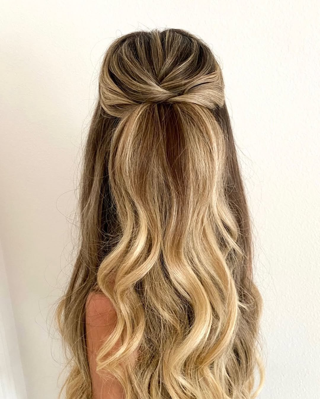 Half up half down is one of the most popular hairstyles for a reason. Less formal than a full updo, it’s more special than simple curls. Half up styles are easy to wear and are incredibly flattering and feminine.”