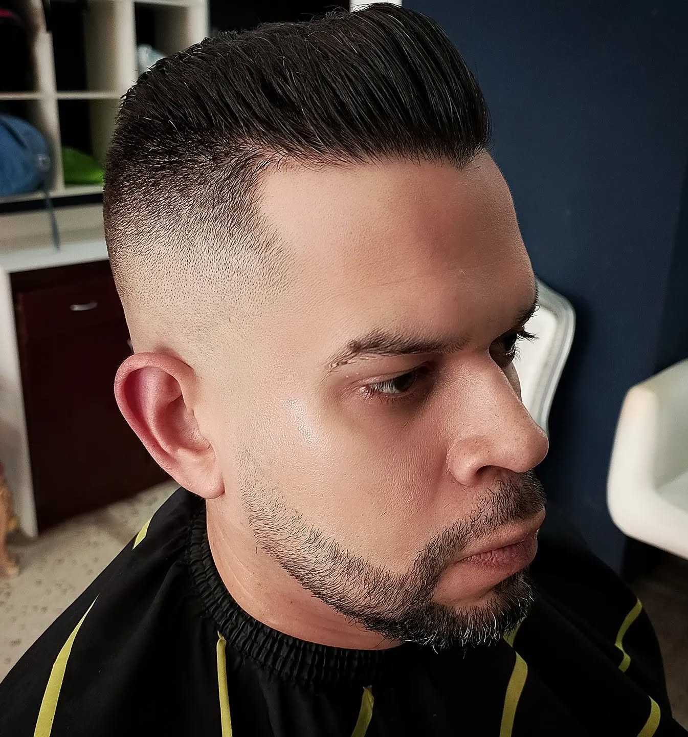 A side part and a fade work beautifully together. The parted hair creates a unique variation on the traditional pompadour style, adding sophistication and structure to your look. This combination suits both casual and business environments.