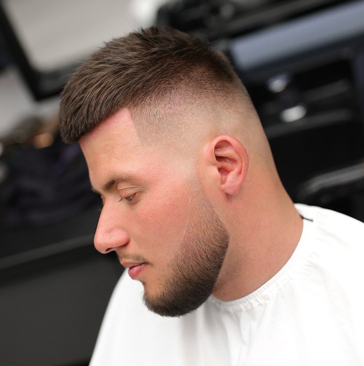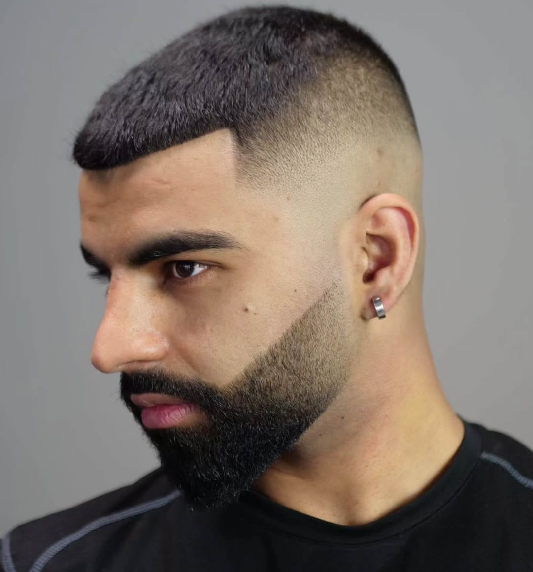 Precision defines this style. The line-up should look ruler-straight, creating sharp, clean edges around your hairline. Keep the top section to about one inch for a tight, close crop. Match your beard fade to your hair fade for a cohesive, well-groomed appearance.
