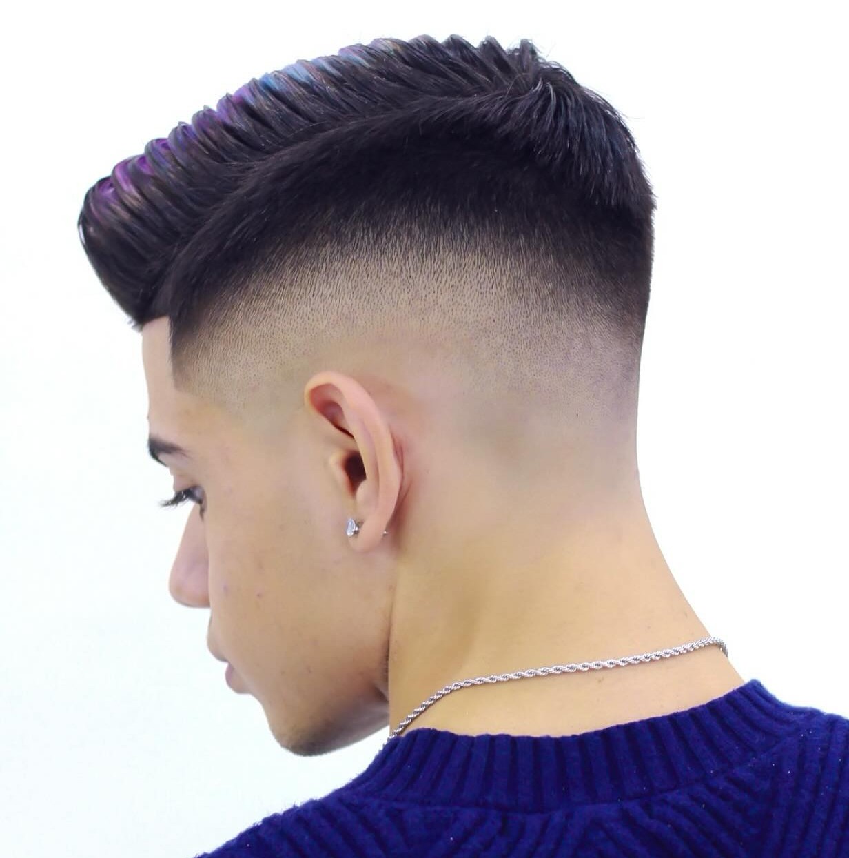 This skin fade cut helps you achieve a polished, contemporary look, as the hair seems to move seamlessly from thick to thin with a line up perfecting the edges. Slick back your hair into a puffed-up pompadour with texturizing pomade and spritz with hairspray if your hair doesn’t hold a pouf well.