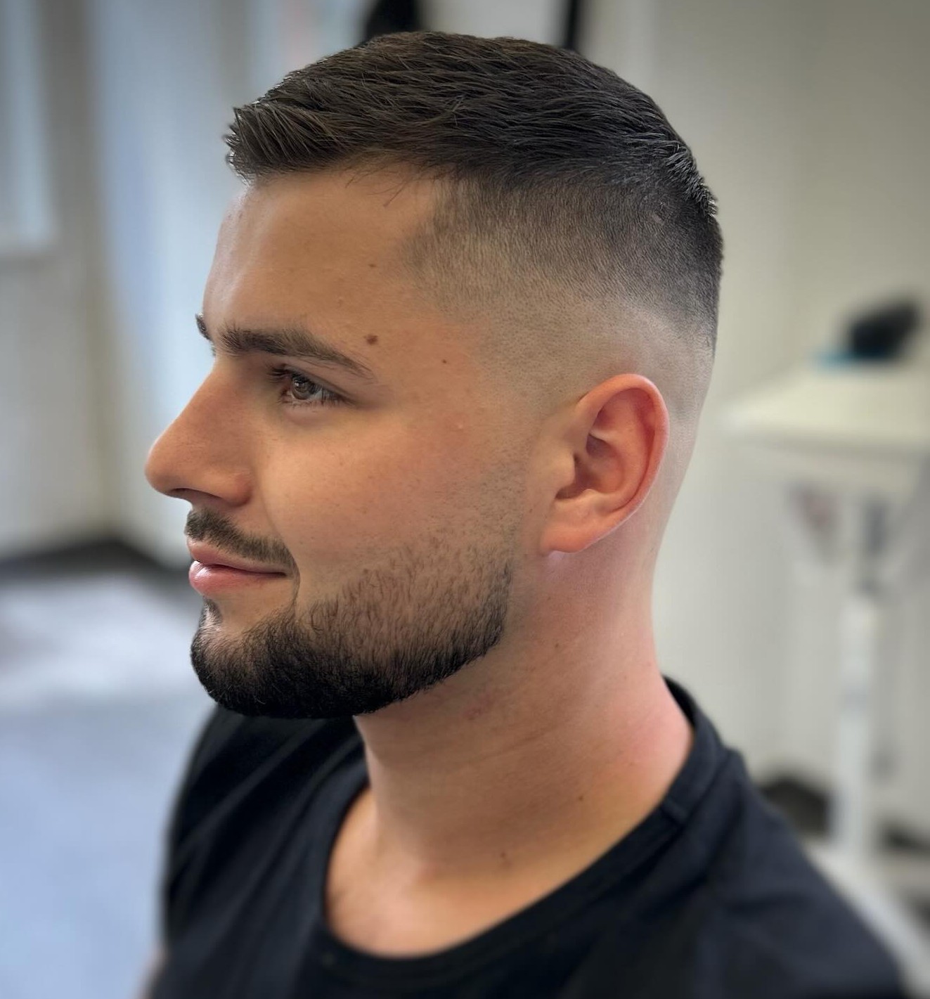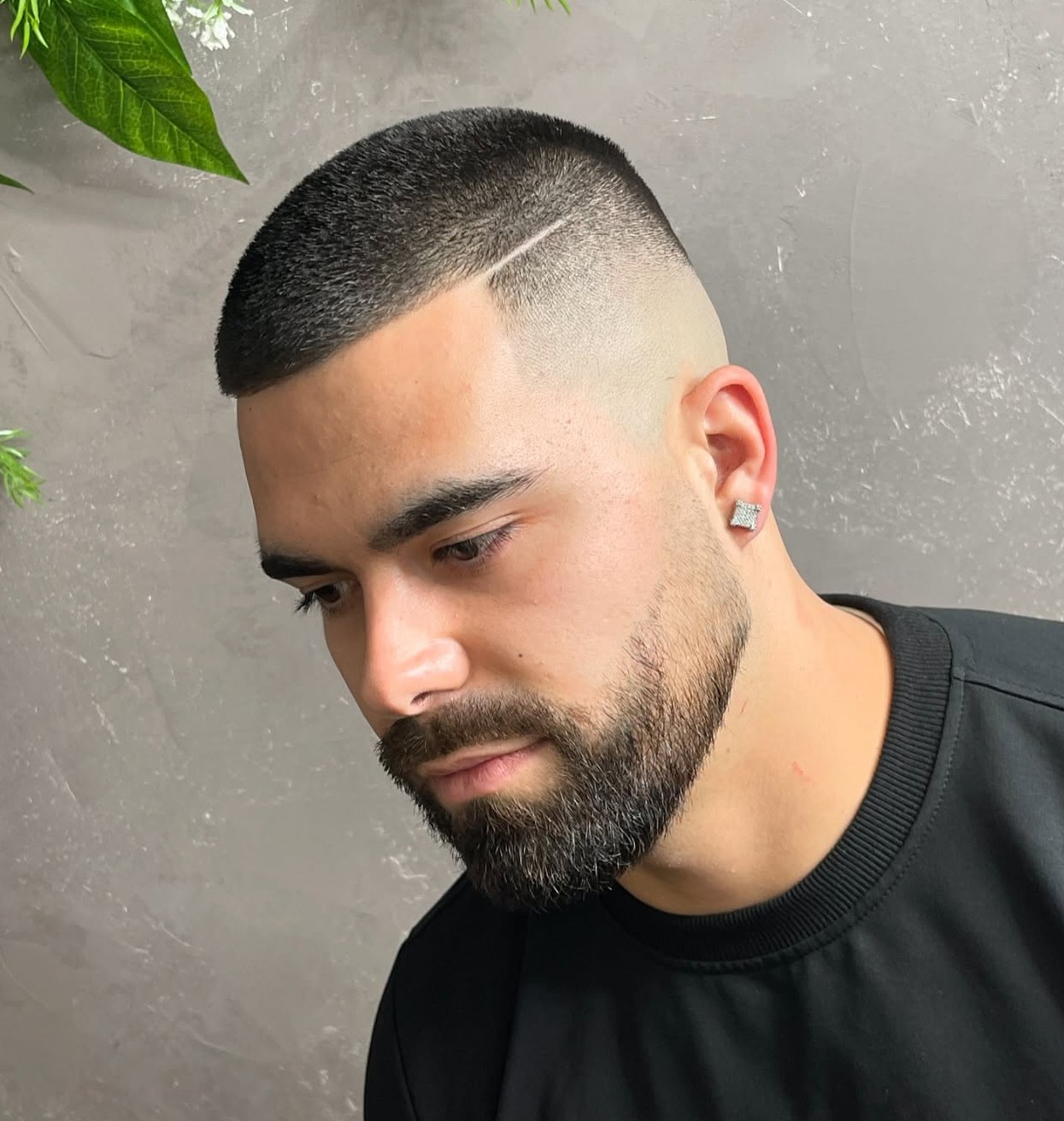 Precision defines this style. The line-up should look ruler-straight, creating sharp, clean edges around your hairline. Keep the top section to about one inch for a tight, close crop. Match your beard fade to your hair fade for a cohesive, well-groomed appearance.