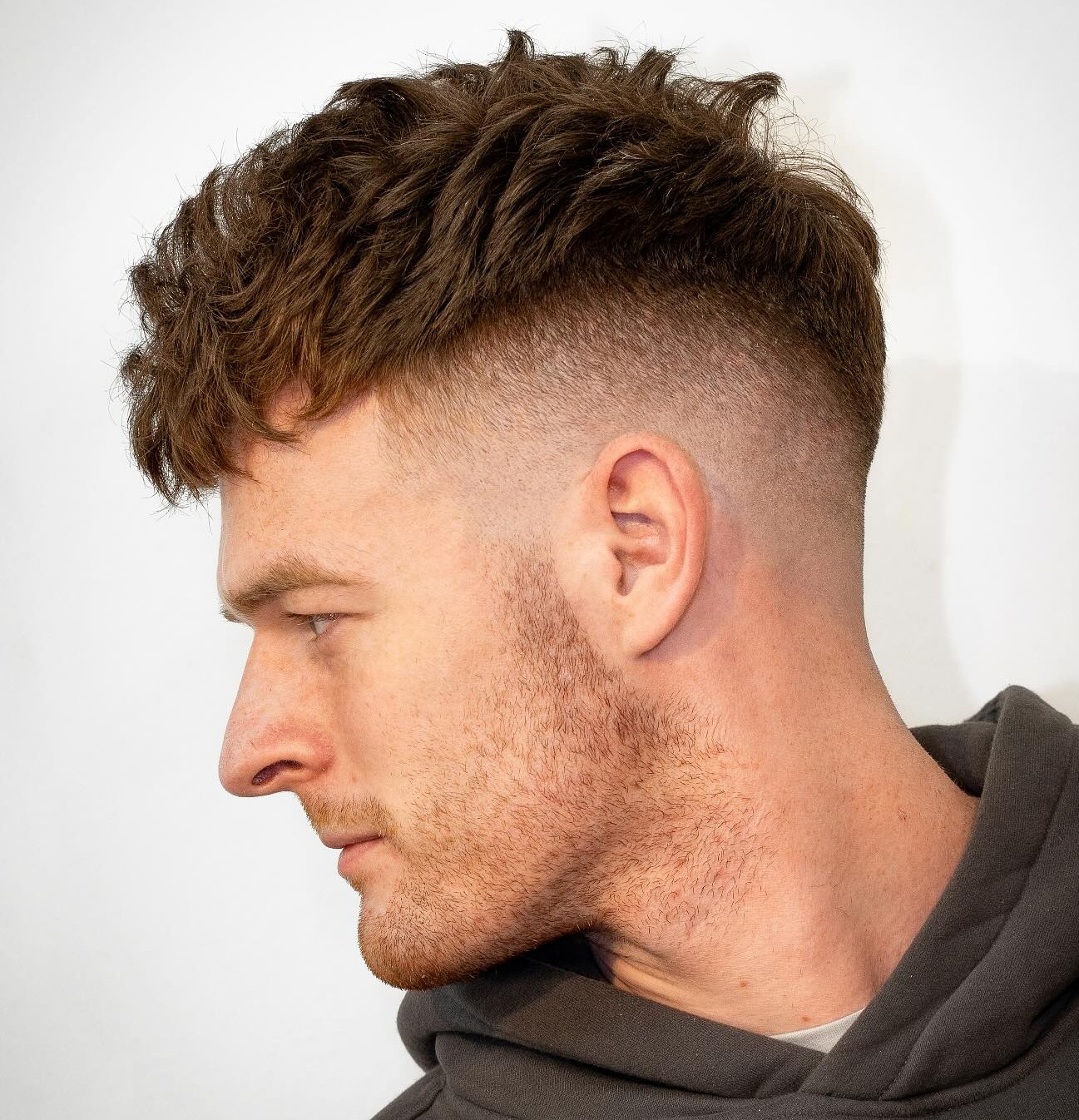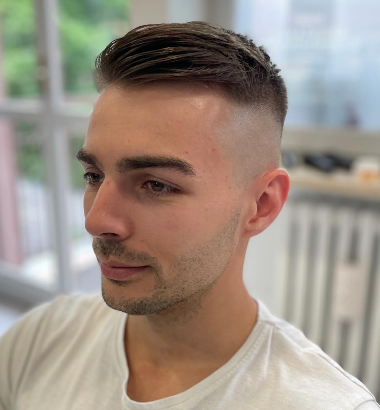 A temple fade is a great choice if you want to go shorter but are afraid of major changes in your appearance. Here, the sideburns are shaved off (partly or completely). Sometimes a small area by the ears is also trimmed.