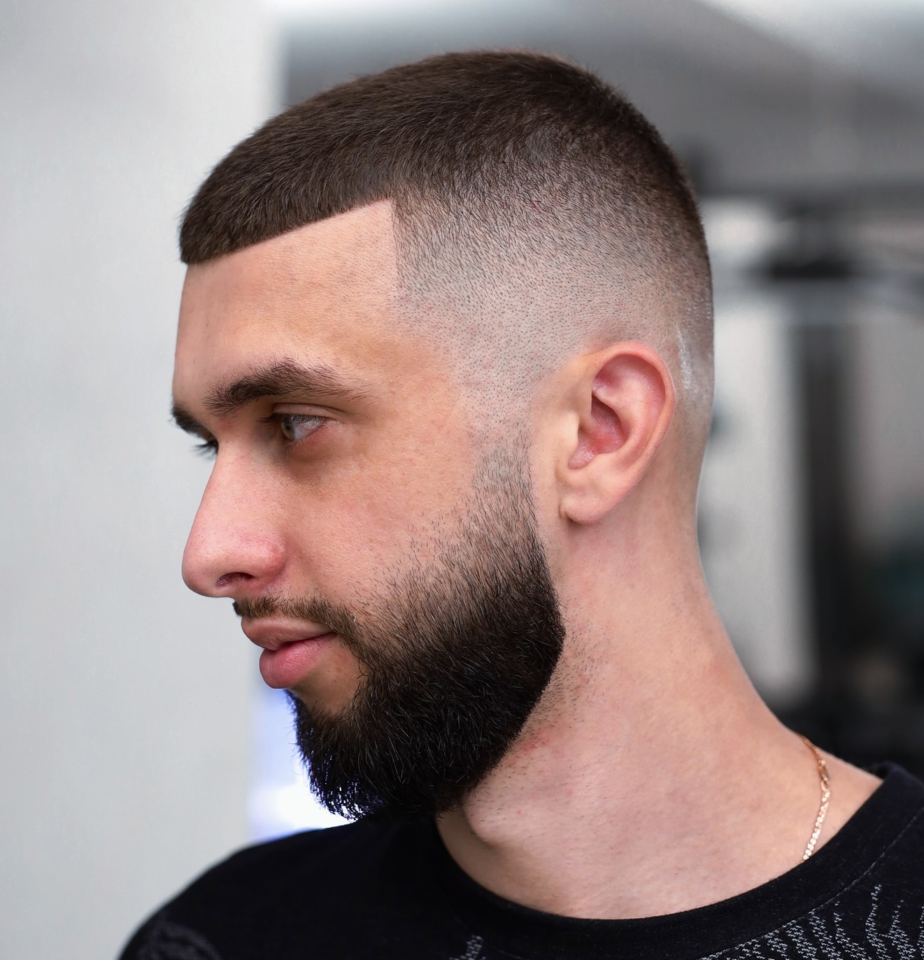 Precision defines this style. The line-up should look ruler-straight, creating sharp, clean edges around your hairline. Keep the top section to about one inch for a tight, close crop. Match your beard fade to your hair fade for a cohesive, well-groomed appearance.