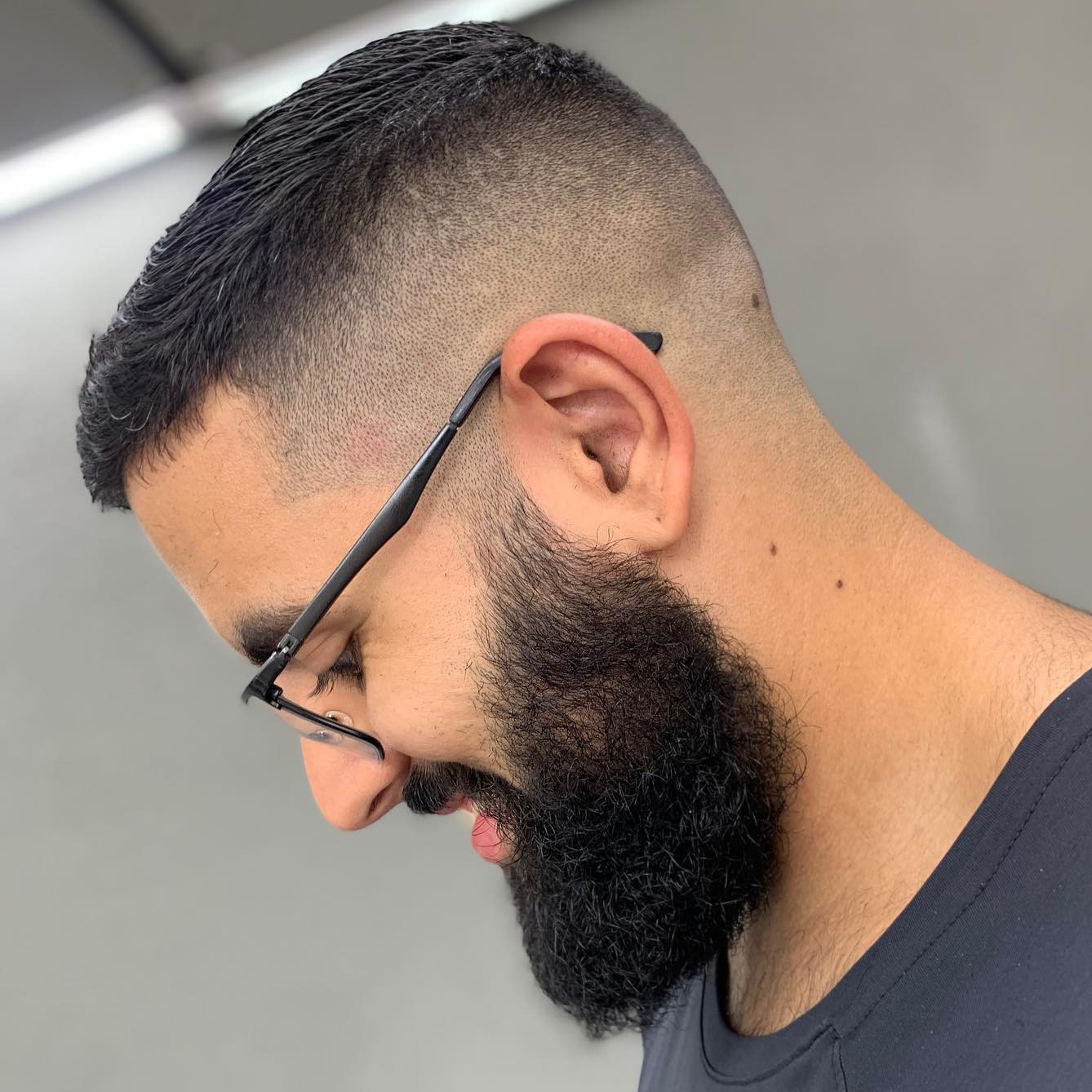 Precision defines this style. The line-up should look ruler-straight, creating sharp, clean edges around your hairline. Keep the top section to about one inch for a tight, close crop. Match your beard fade to your hair fade for a cohesive, well-groomed appearance.