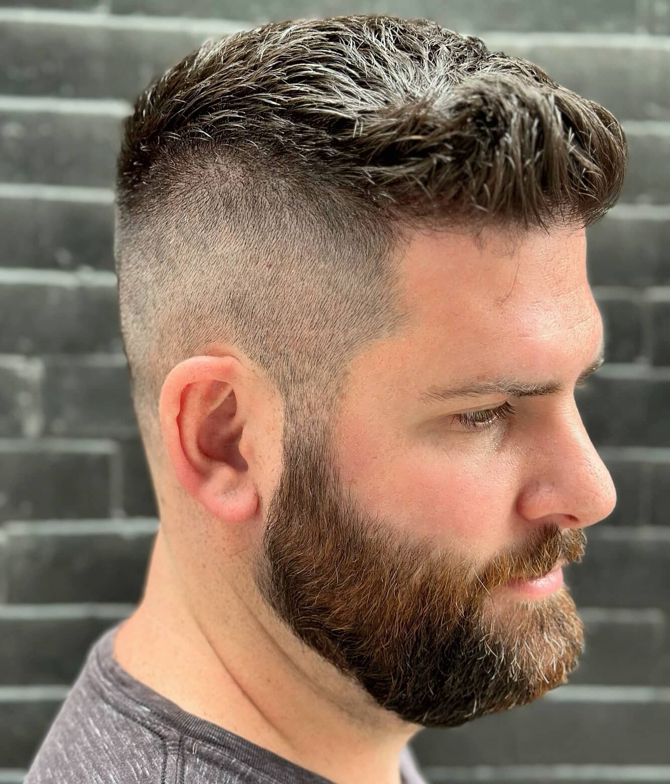 Precision defines this style. The line-up should look ruler-straight, creating sharp, clean edges around your hairline. Keep the top section to about one inch for a tight, close crop. Match your beard fade to your hair fade for a cohesive, well-groomed appearance.