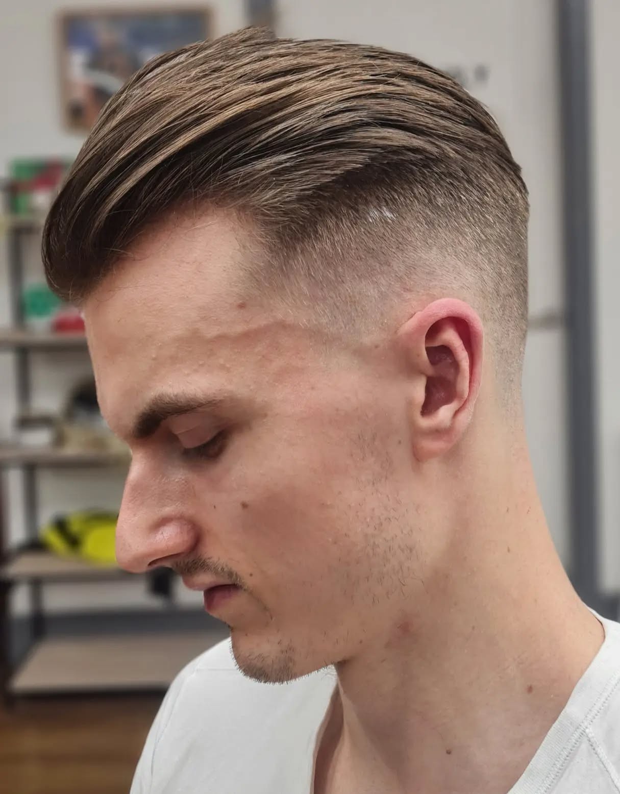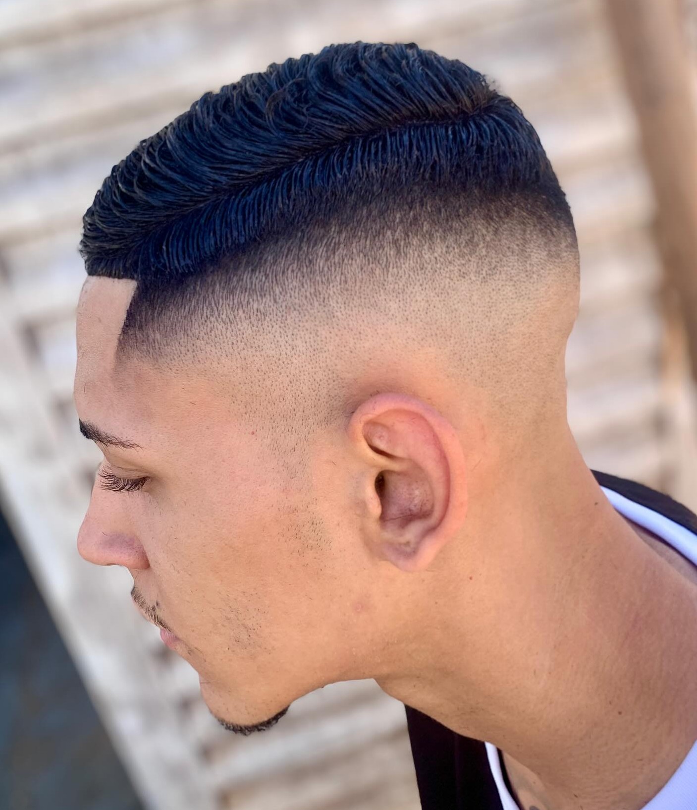 A side part and a fade work beautifully together. The parted hair creates a unique variation on the traditional pompadour style, adding sophistication and structure to your look. This combination suits both casual and business environments.