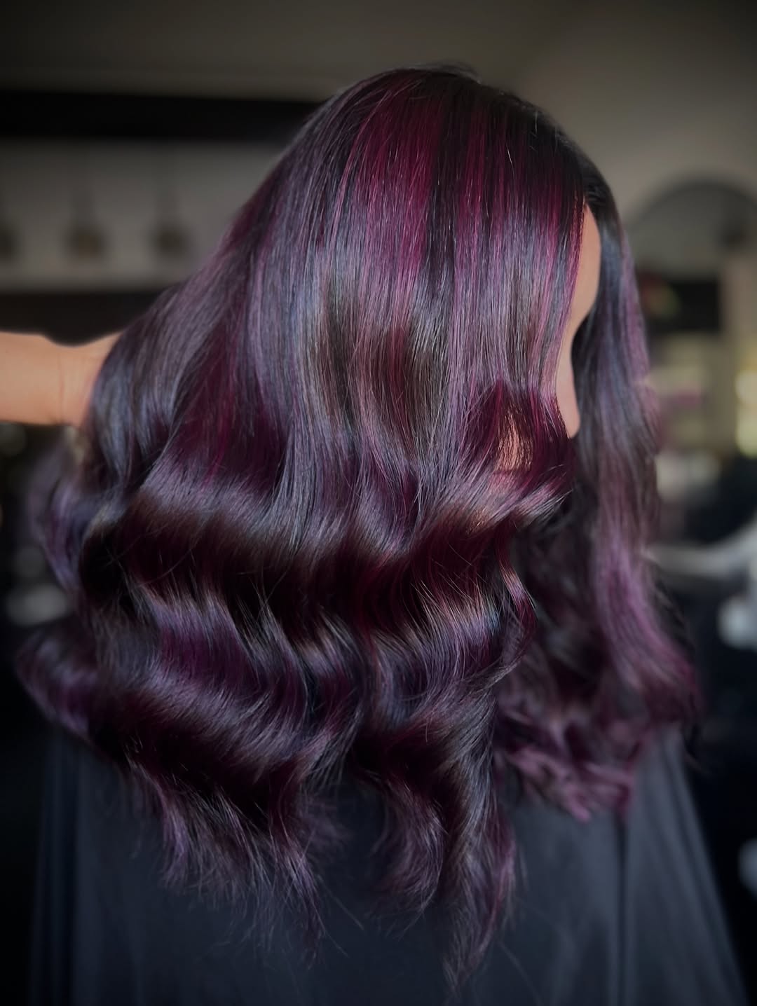 Looking at pictures of different hair dye options, we noticed that you can barely find a smooth blend of brightly colored streaks. But here is a way to add some color, both in burgundy and purple, in varying sections, without being over the top!