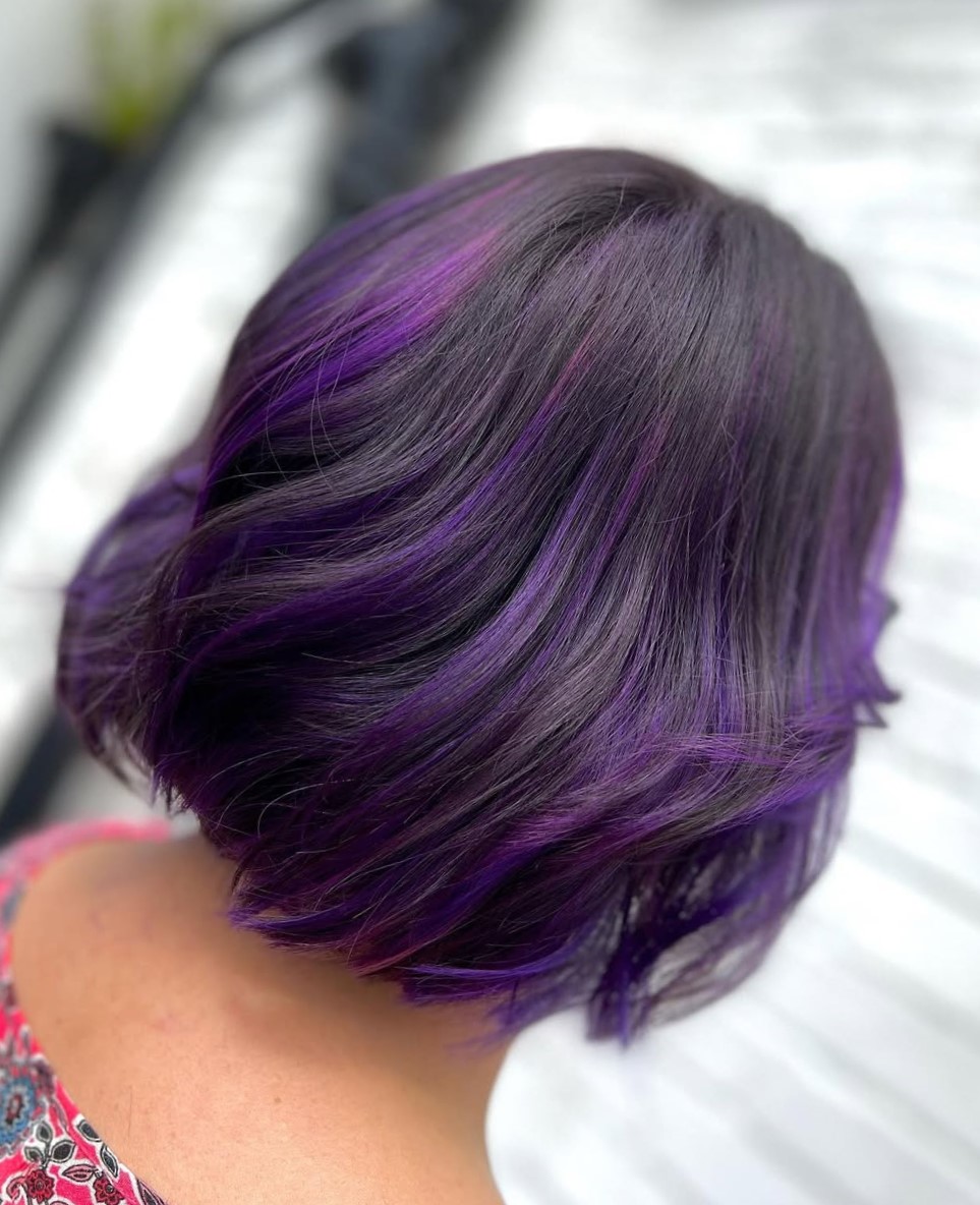 Purple and plum highlights don’t work only with long manes. Short hair can get in on the fun, too. In fact, when completely covered with magenta and purple highlights, bob haircuts become cooler than ever.