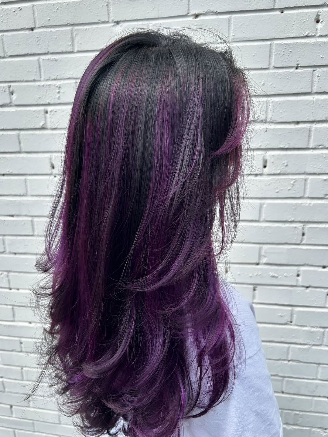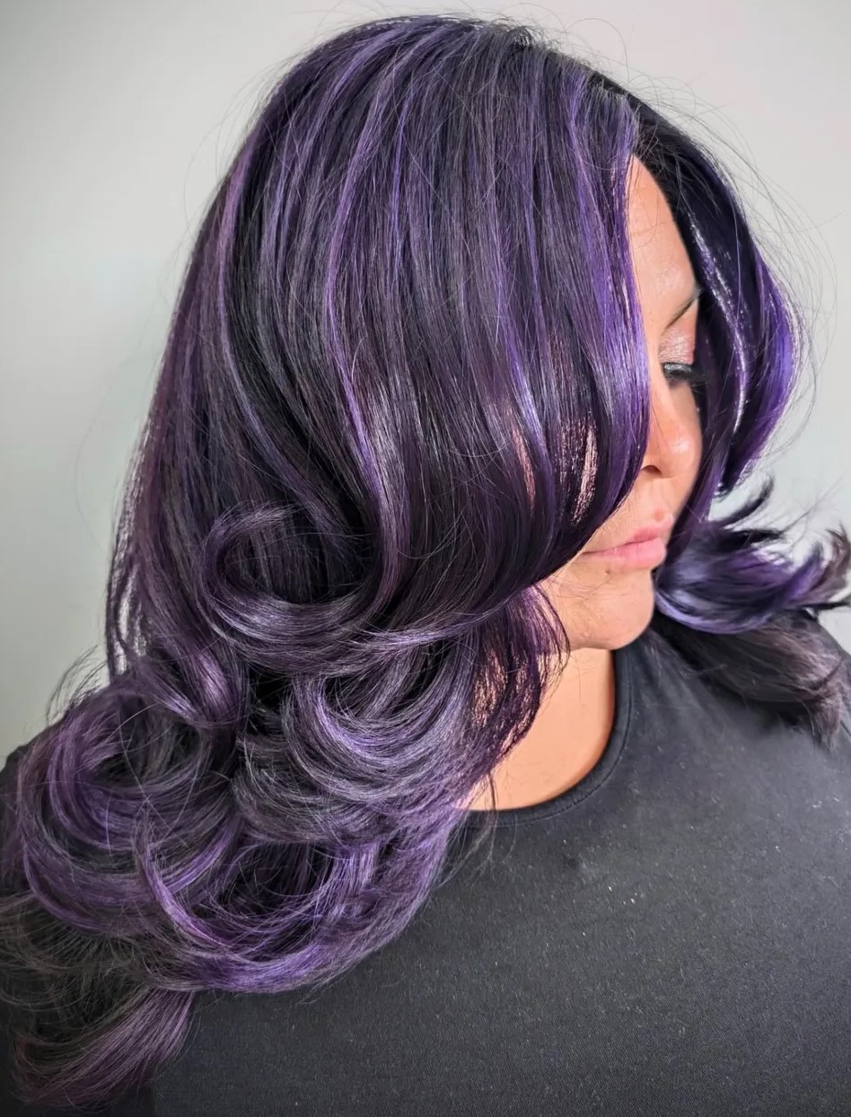 For a hue that stands out more than toned silver locks, you must look for a purple with a blue base. It is softer than the red-based shades. Go for an all-over lighter color with dark roots and just a bit of lowlights to really bring out your individuality!