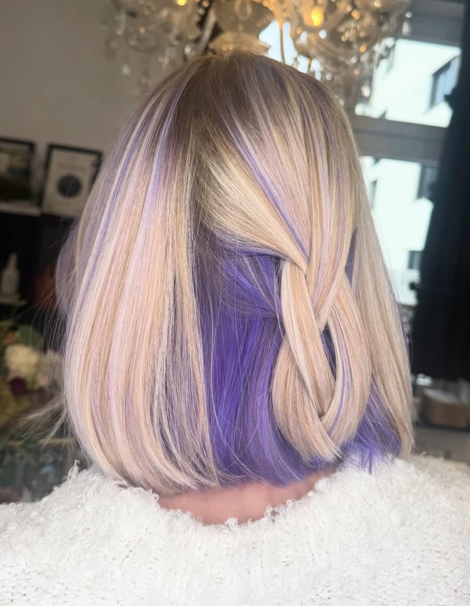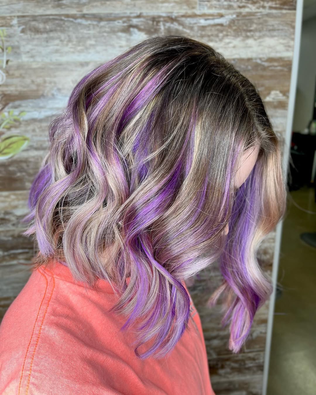 Purple highlights can also be just a small detail, sneaking in under the radar. These chunks of lighter purple are hidden underneath the blonde base in a small amount of lowlights. Add them in various spots for a little extra fun!