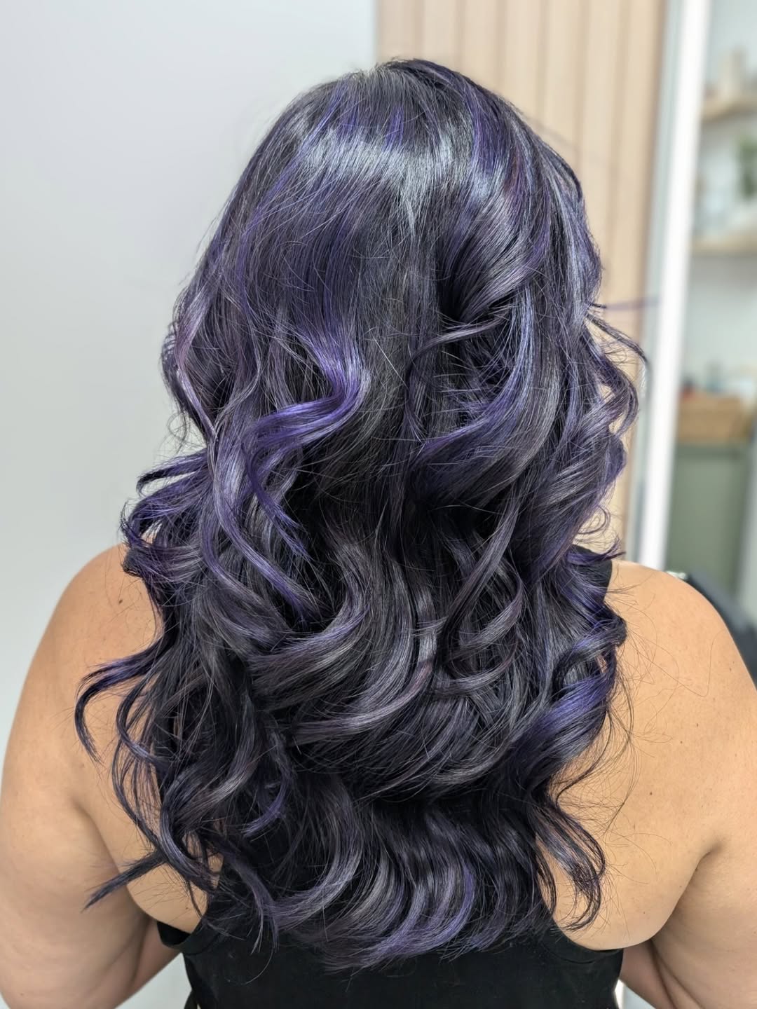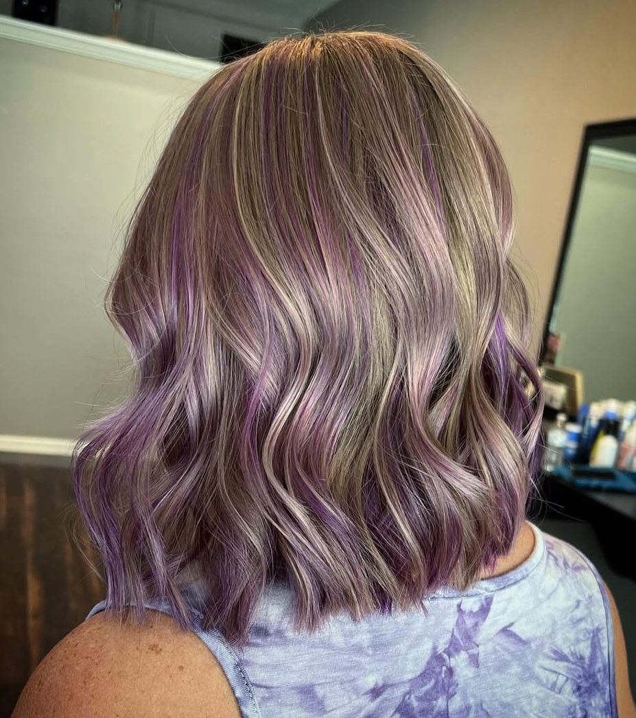Purple and blonde together create a striking, dreamy contrast. Styled into soft, voluminous waves, the look feels elegant and eye-catching, offering a modern take on a whimsical color.
