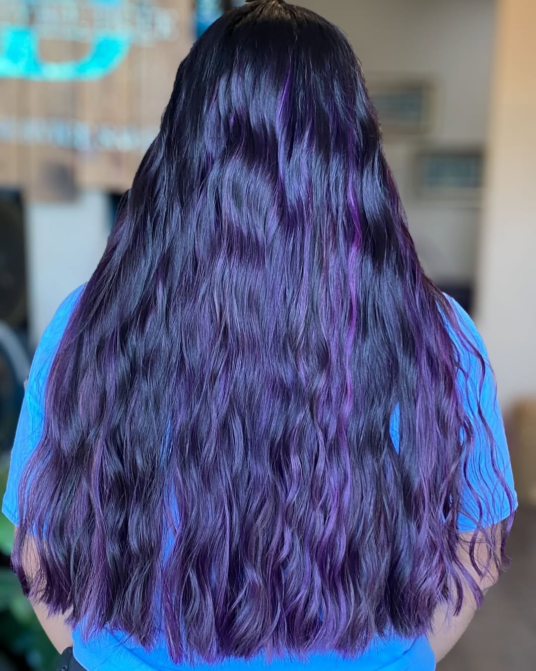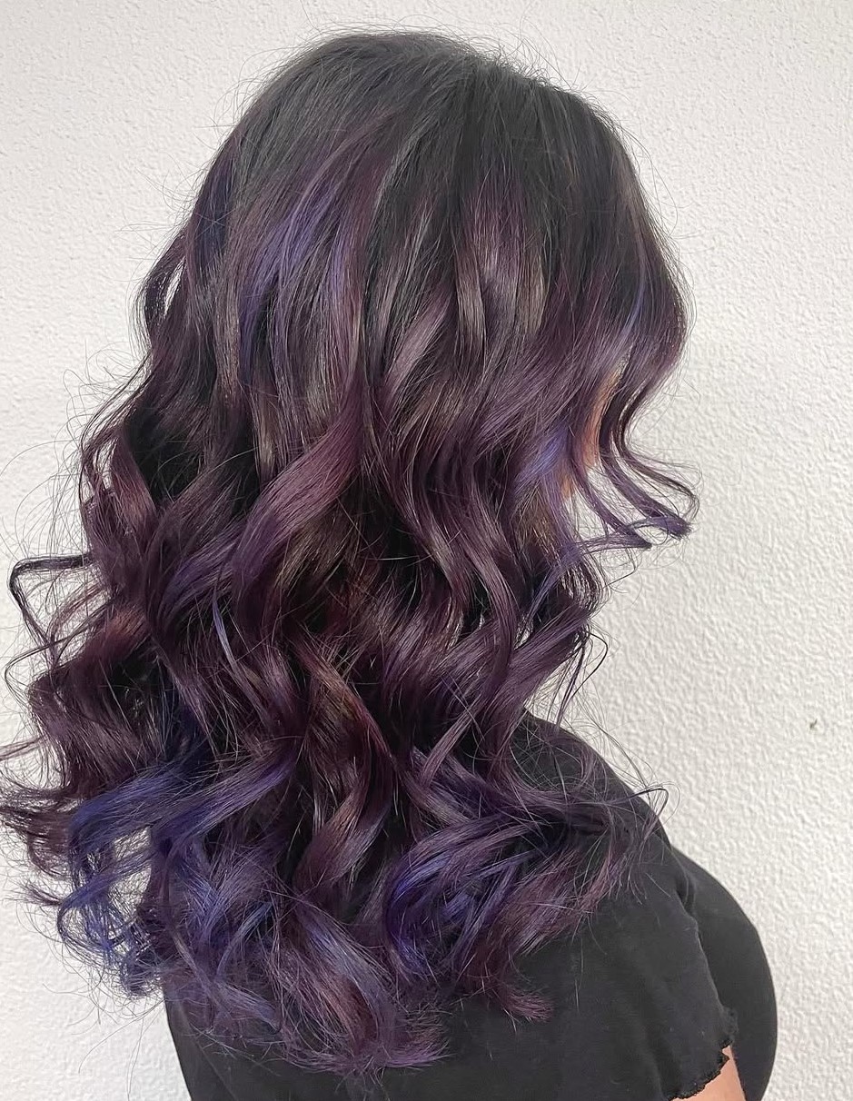 Black hair with purple highlights is quite stunning as it stands. In this picture instead the long curls cascading in an ombre pattern, going from a dark cobalt hue to a mystical shade of violet offers a dramatic, eye-catching finish.