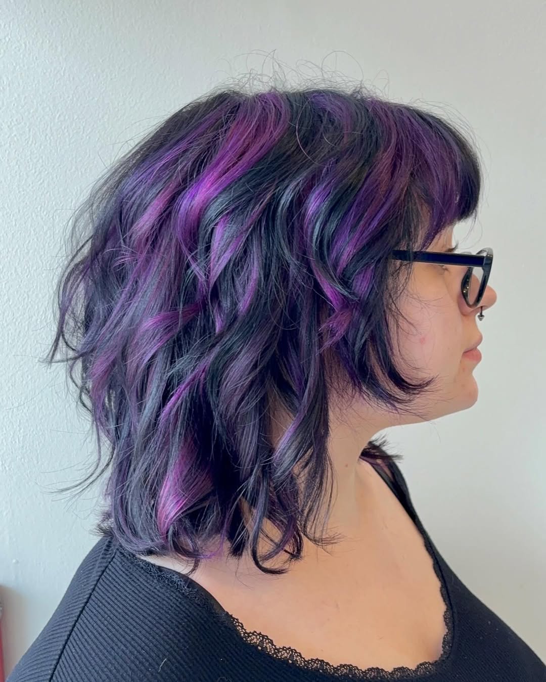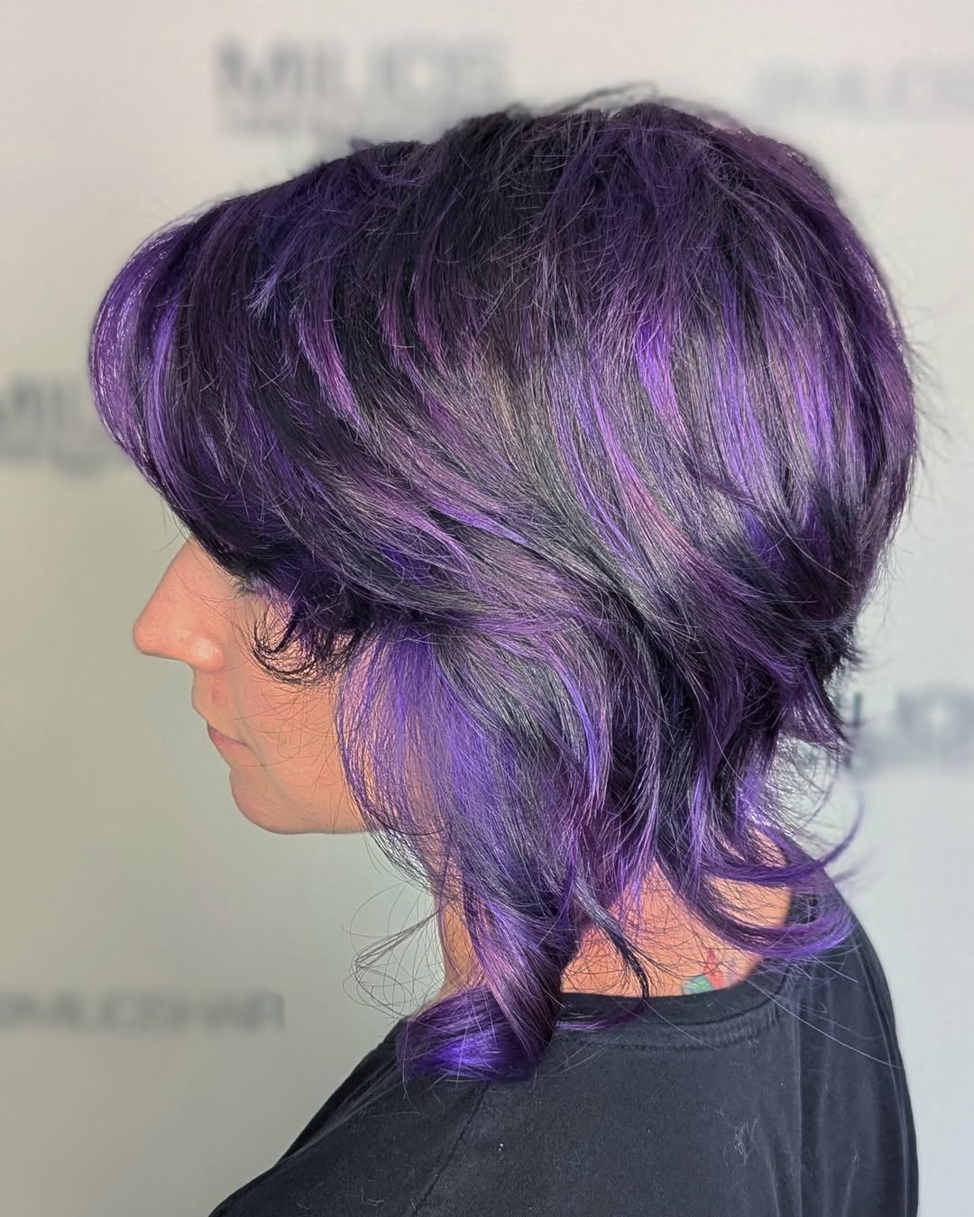 This violet and purple combination is perfect for any season! A set of light highlights emphasizes the base in the angled bob. A dark shade underneath brings out the prominence of the purple quite well!