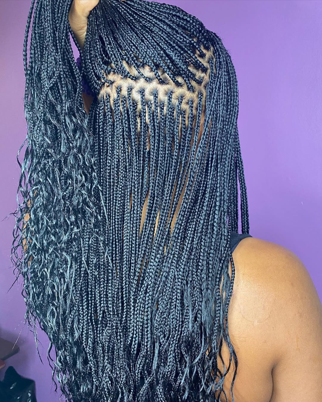 When it comes to tiny braids, you can never go wrong with a classic look: long, sleek, and undeniably chic. These long braids look like your typical straightened hair, except for the fact that you won’t spend any unnecessary time styling it with heat tools or combing through it.
