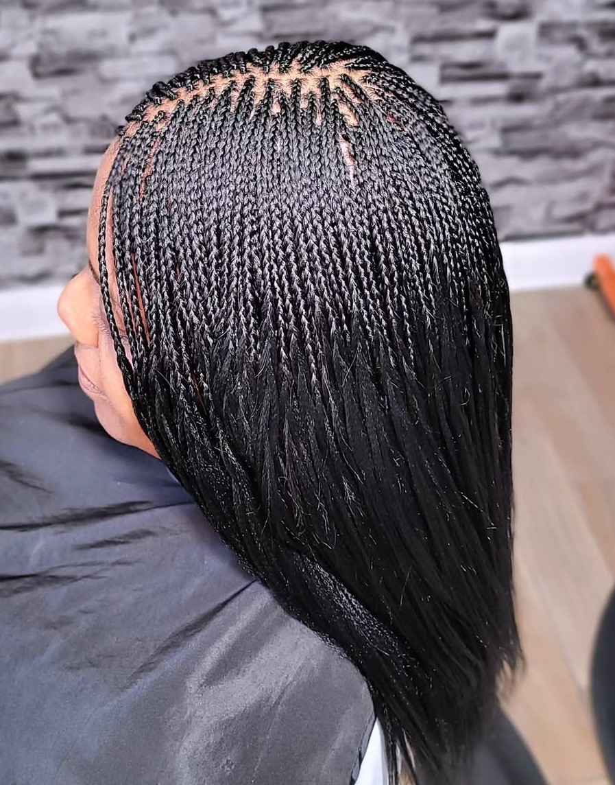 When it comes to tiny braids, you can never go wrong with a classic look: long, sleek, and undeniably chic. These long braids look like your typical straightened hair, except for the fact that you won’t spend any unnecessary time styling it with heat tools or combing through it.