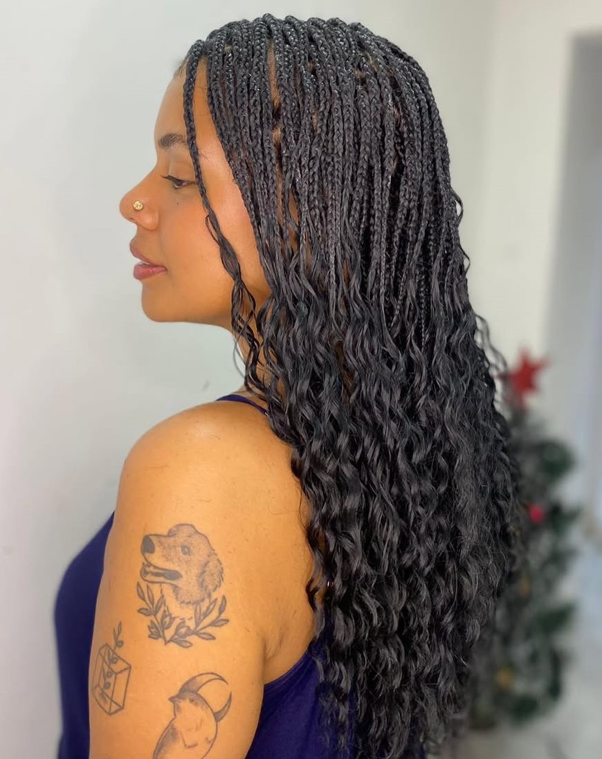 When it comes to tiny braids, you can never go wrong with a classic look: long, sleek, and undeniably chic. These long braids look like your typical straightened hair, except for the fact that you won’t spend any unnecessary time styling it with heat tools or combing through it.