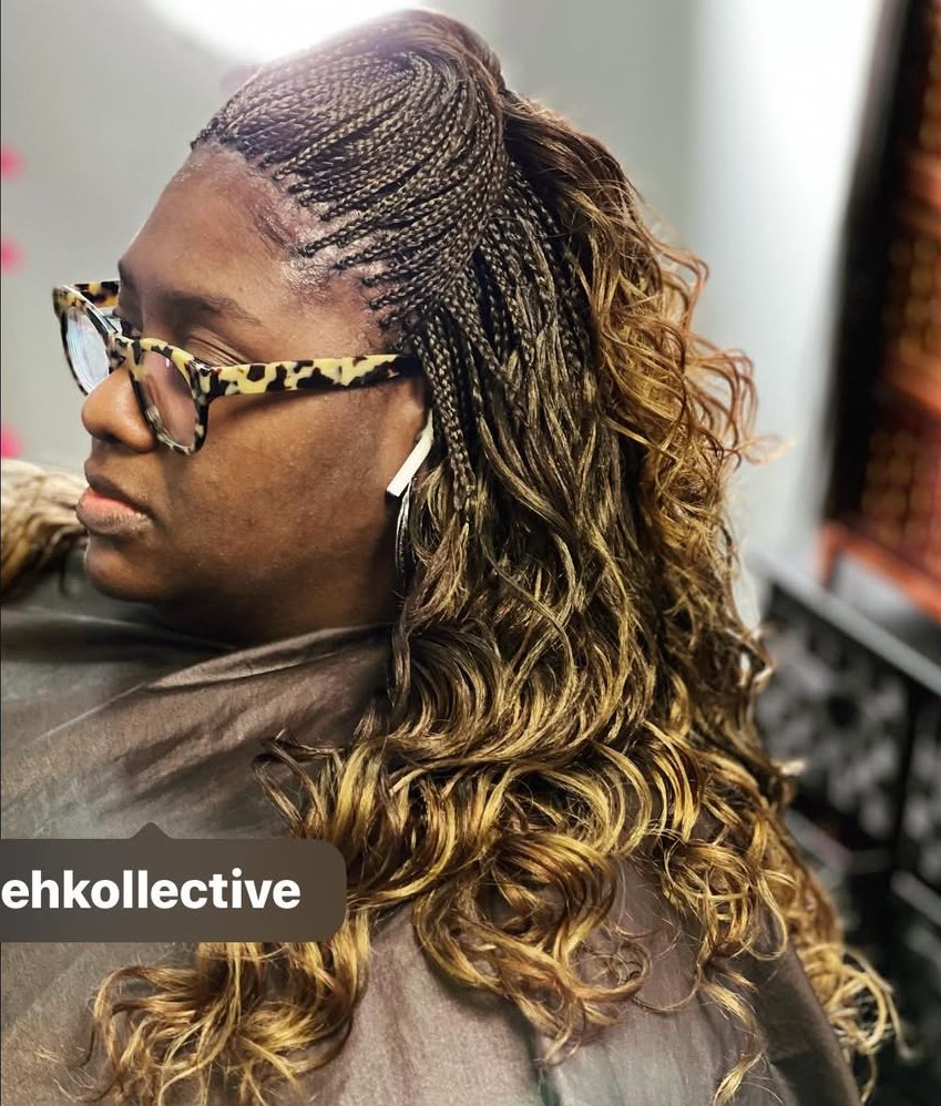 The wet look is in, and it’s gorgeous when applied to curls. The benefit of braiding a few inches off the roots is that it allows the hair to lie flat on top. If you’re not into the super voluminous look (but you still want curls), ask your braider to start the transition about four inches away from the roots.