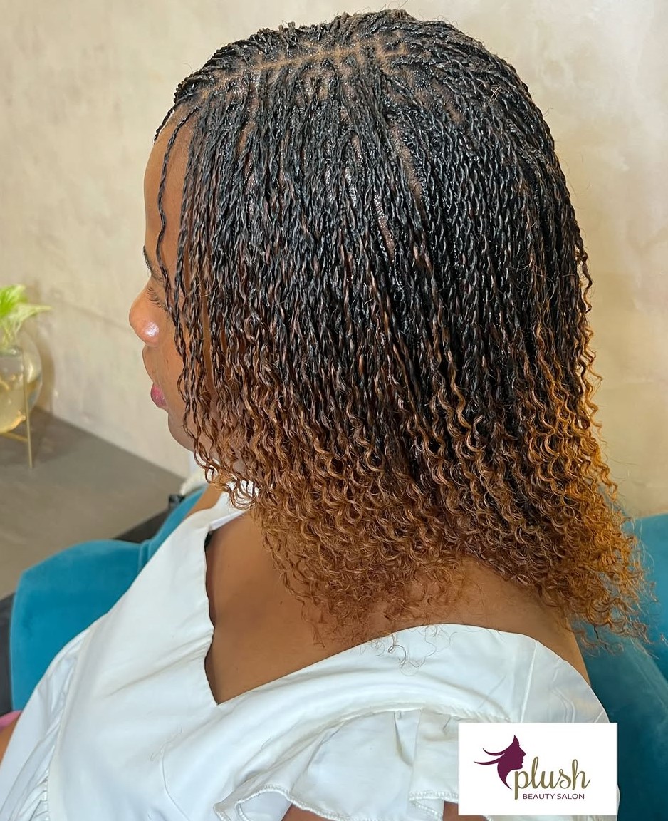 Micro braiding can take on many, many forms (one of its best characteristics), with short, cropped cuts being one of them. Playing with color safely is also among the perks!