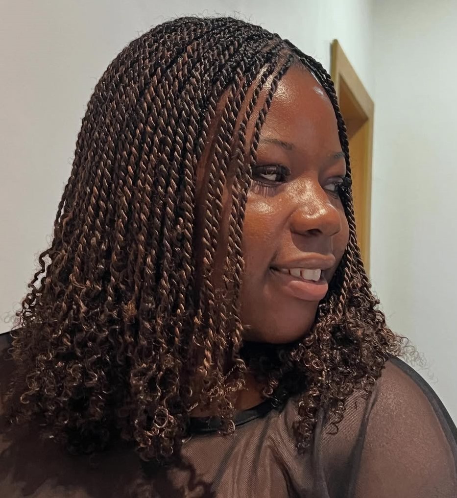 Small kinky twists are a cute alternative to skinny braids. You may not twist all the way down to the ends and seal them. The half-twists, half-curls are as beautiful in the free-flowing shoulder-length style as they would be in a short curly pony.