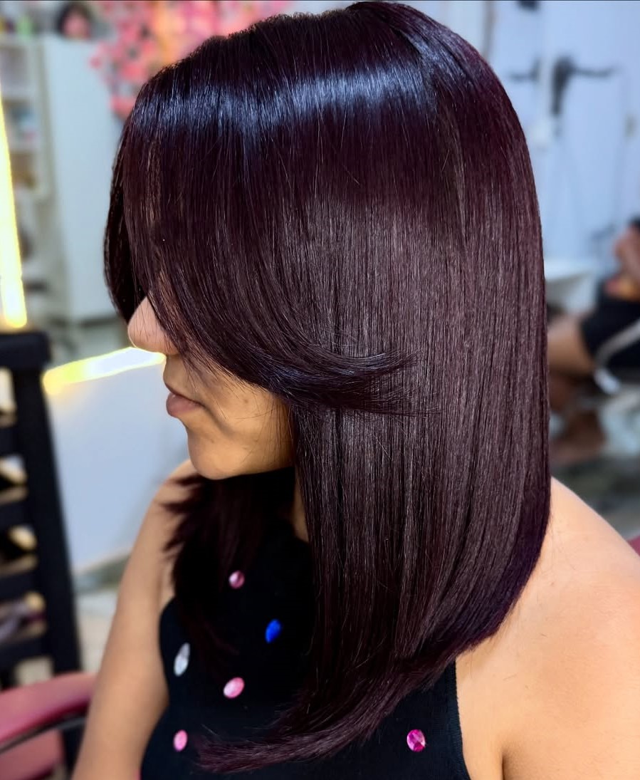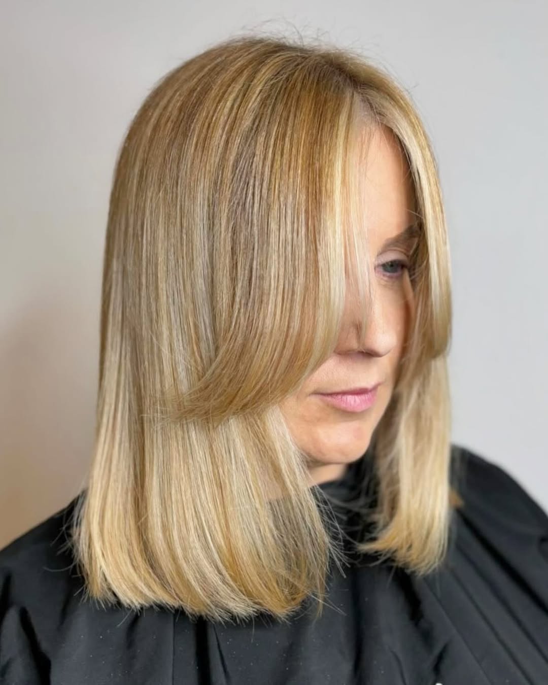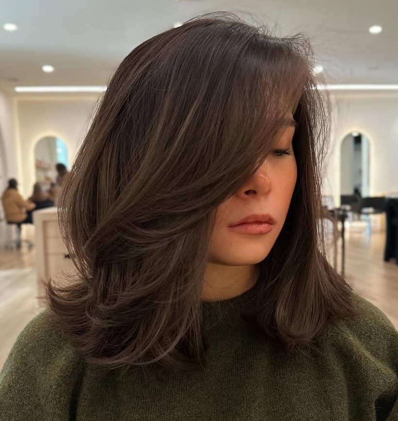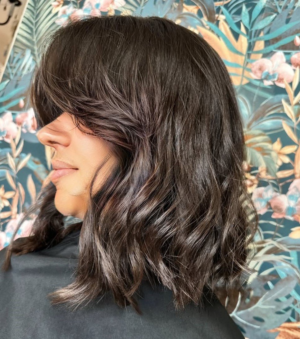 A long bob with side-swept bangs has an undeniable “cool girl” vibe. This particular lob is effortless to maintain, yet alluring with its chic fringe and soft waves, making it an ideal choice for women seeking to achieve an elegant and refined look.
