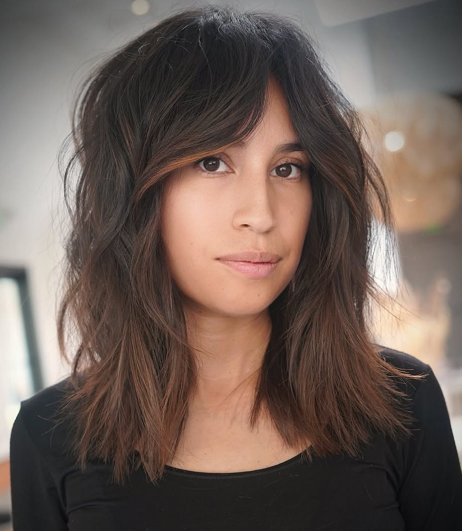 This medium bob with bangs has a charmingly tousled appearance. It boasts textured layers and highlights that mimic a sun-kissed effect, adding depth and dimension to the style. The flipped-up ends also give it a captivating allure.