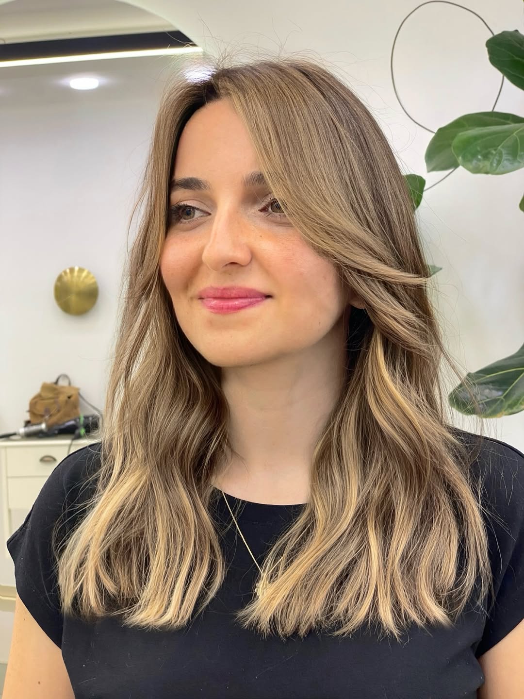 A traditional lob is simple, but bangs make it chic and fancy. Curtain bangs frame the face beautifully and make the locks look shiny and polished. This hairstyle also benefits from trendy balayage, which brings an extra dimension to your medium hair.
