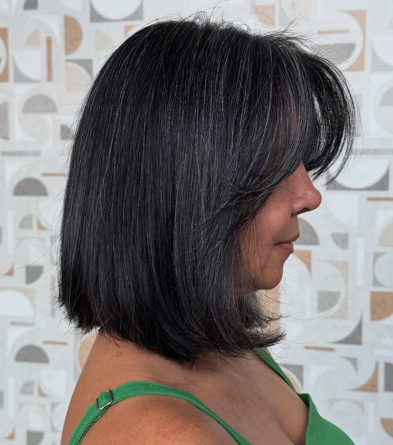 A long bob with side-swept bangs has an undeniable “cool girl” vibe. This particular lob is effortless to maintain, yet alluring with its chic fringe and soft waves, making it an ideal choice for women seeking to achieve an elegant and refined look.