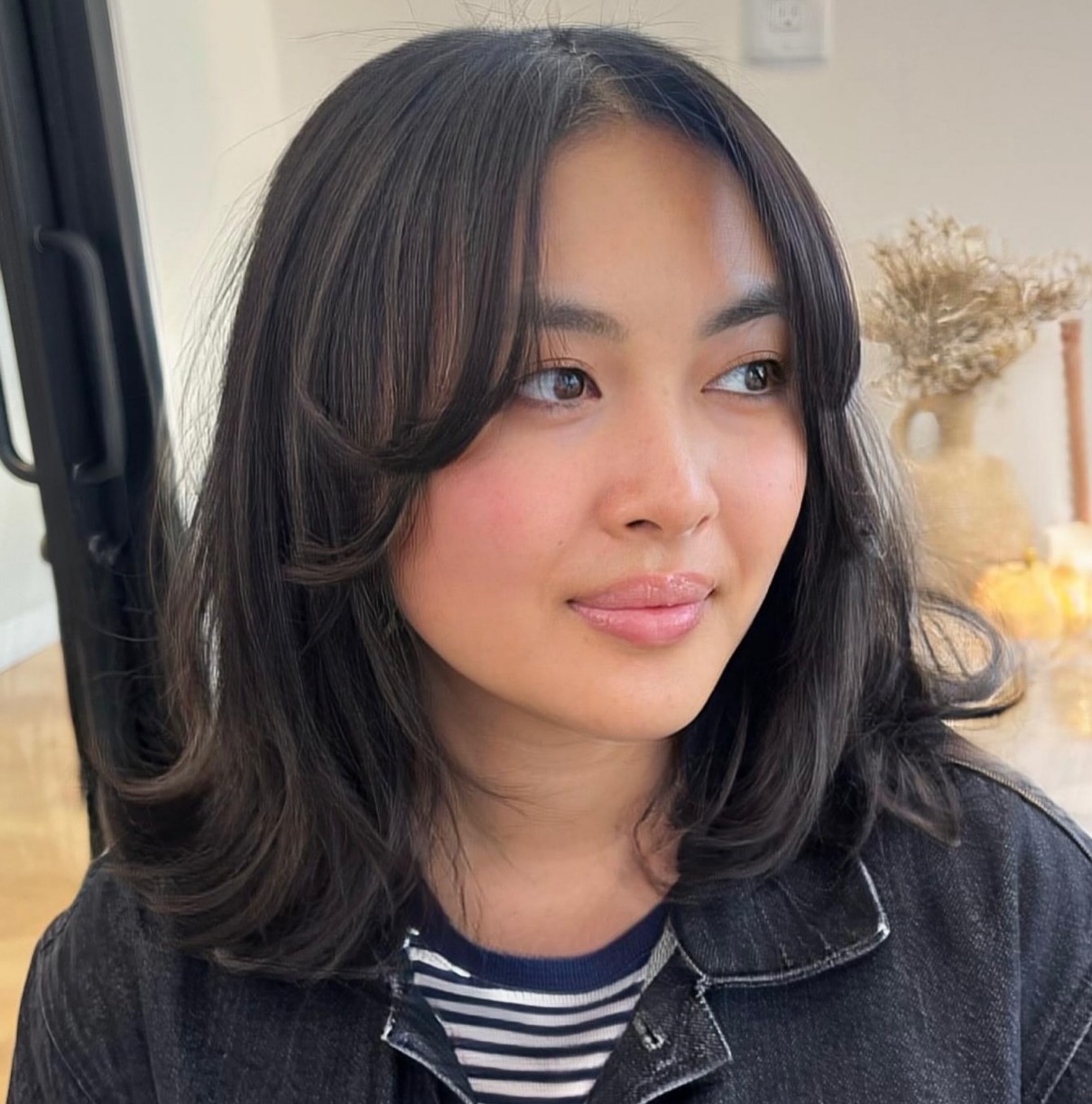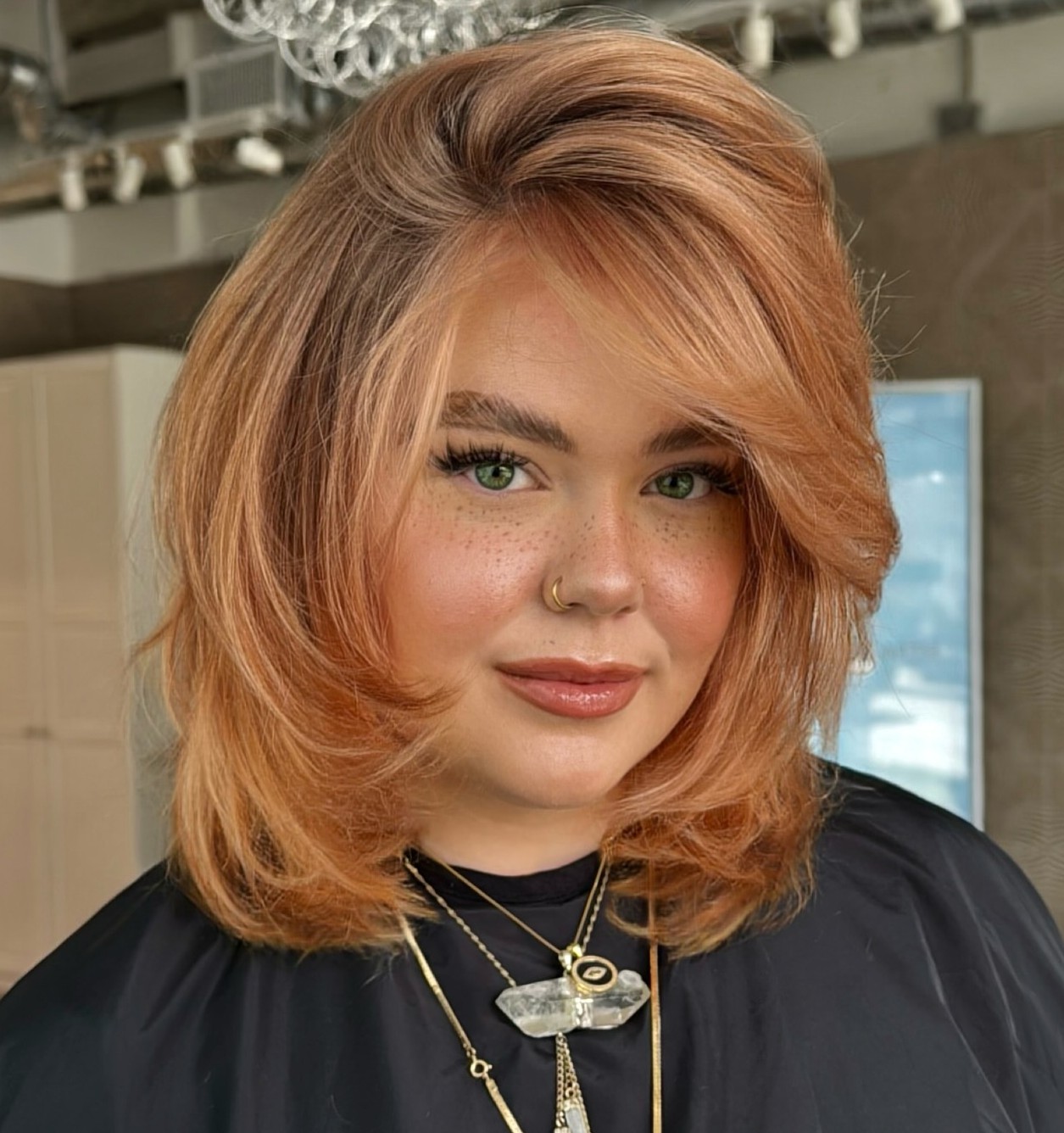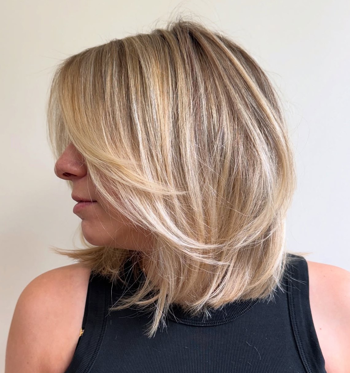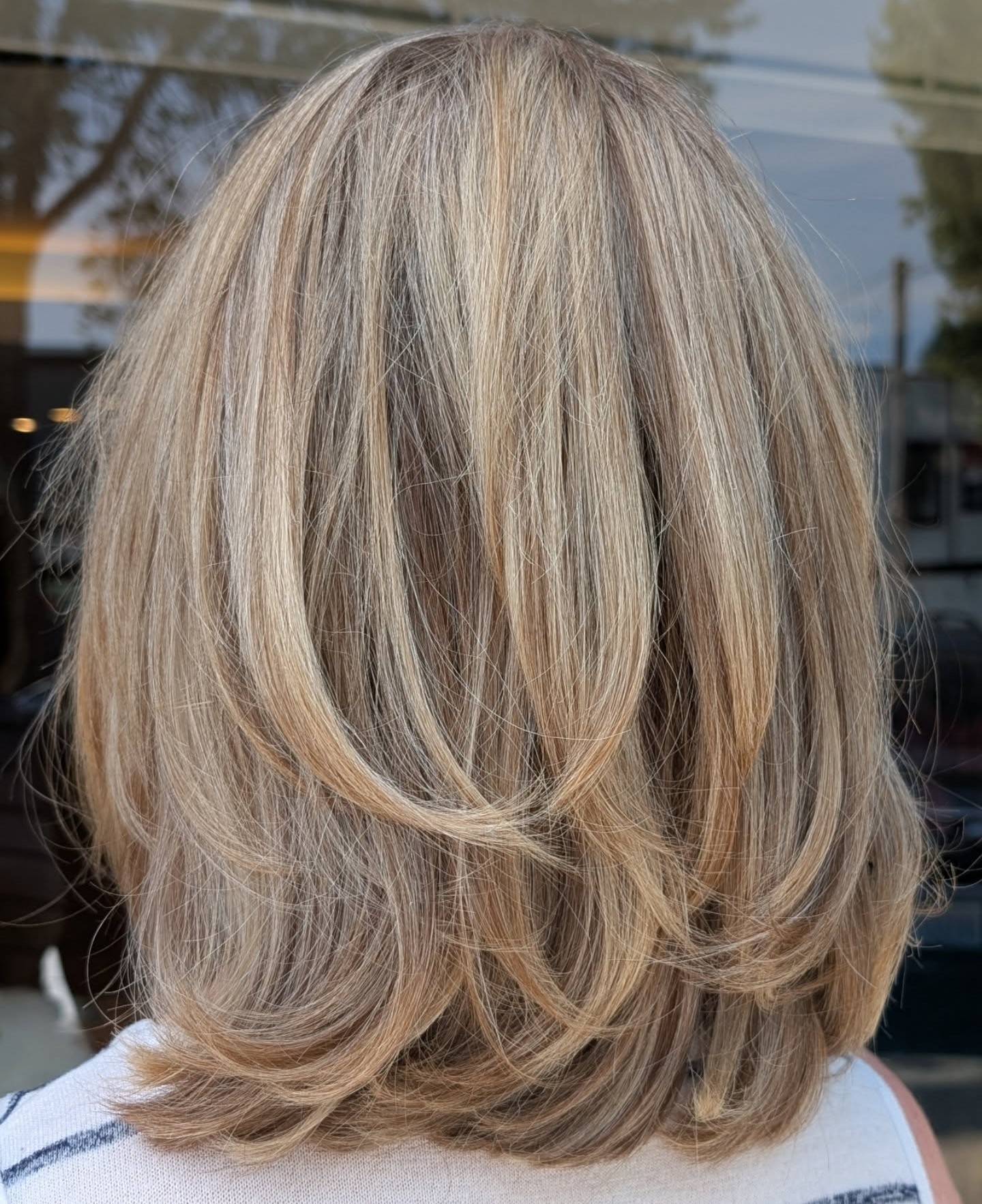 If you’re a volume junky, a deep side part will be your best friend. A light curl and lifting spray will help you achieve this glam style. The chunky layers help balance the boost for a full shape all the way around.