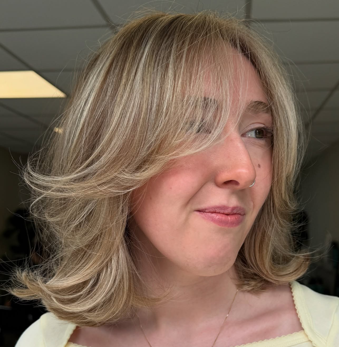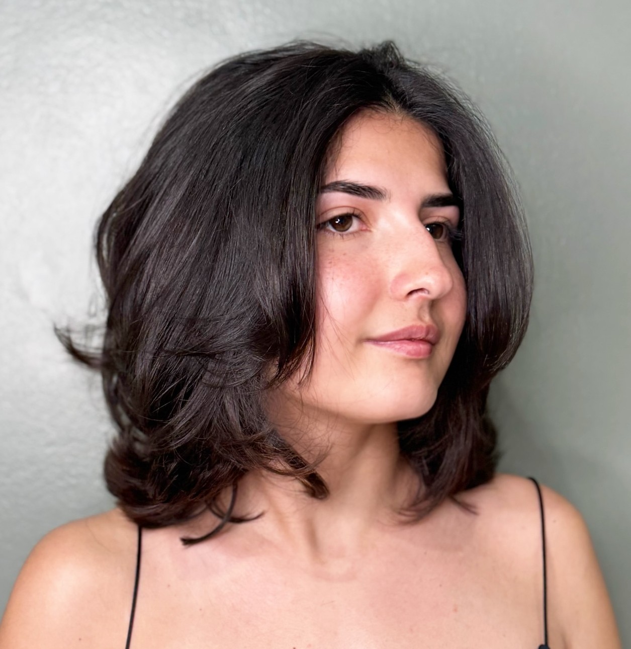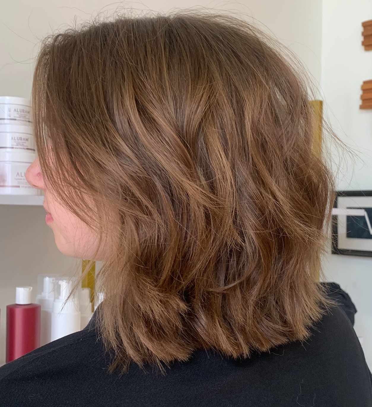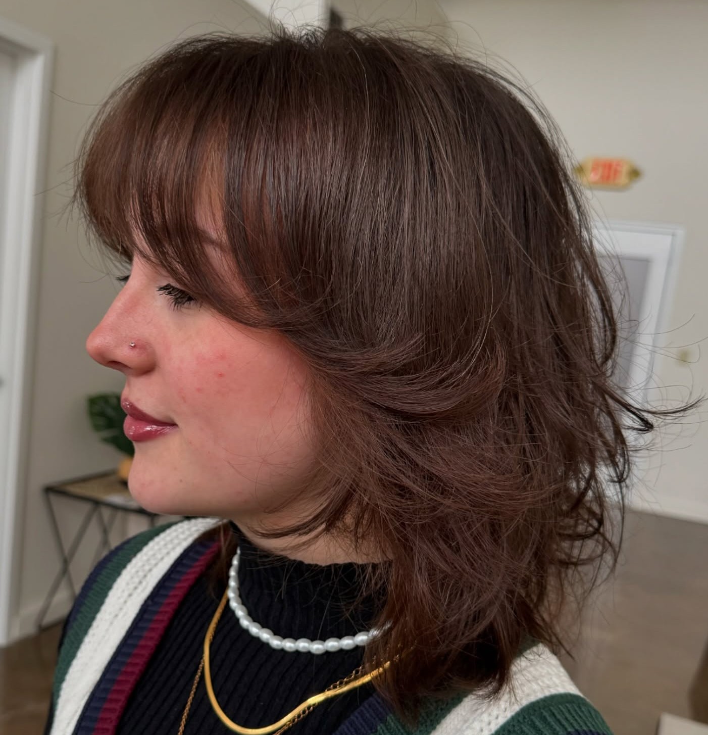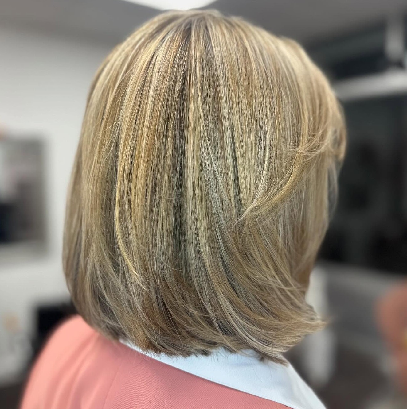If you’re a volume junky, a deep side part will be your best friend. A light curl and lifting spray will help you achieve this glam style. The chunky layers help balance the boost for a full shape all the way around.