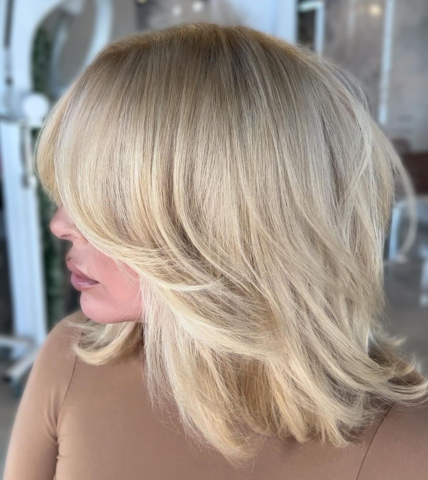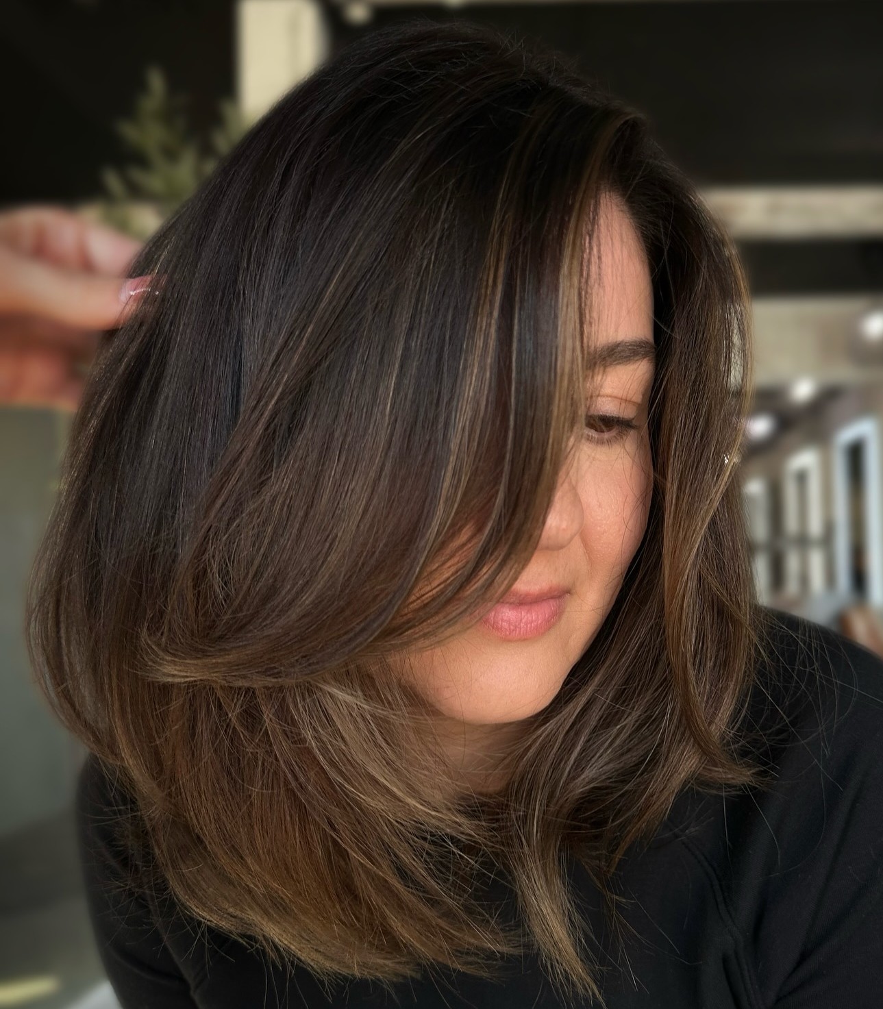 Shaggy lob with wispy bangs is very universal as it suits any face shape and hair texture. With blonde balayage and textured layers, you will get a playful hairstyle that will flatter your lovely appearance. Pro tip: use a texturizing spray to give your hair a tousled look.