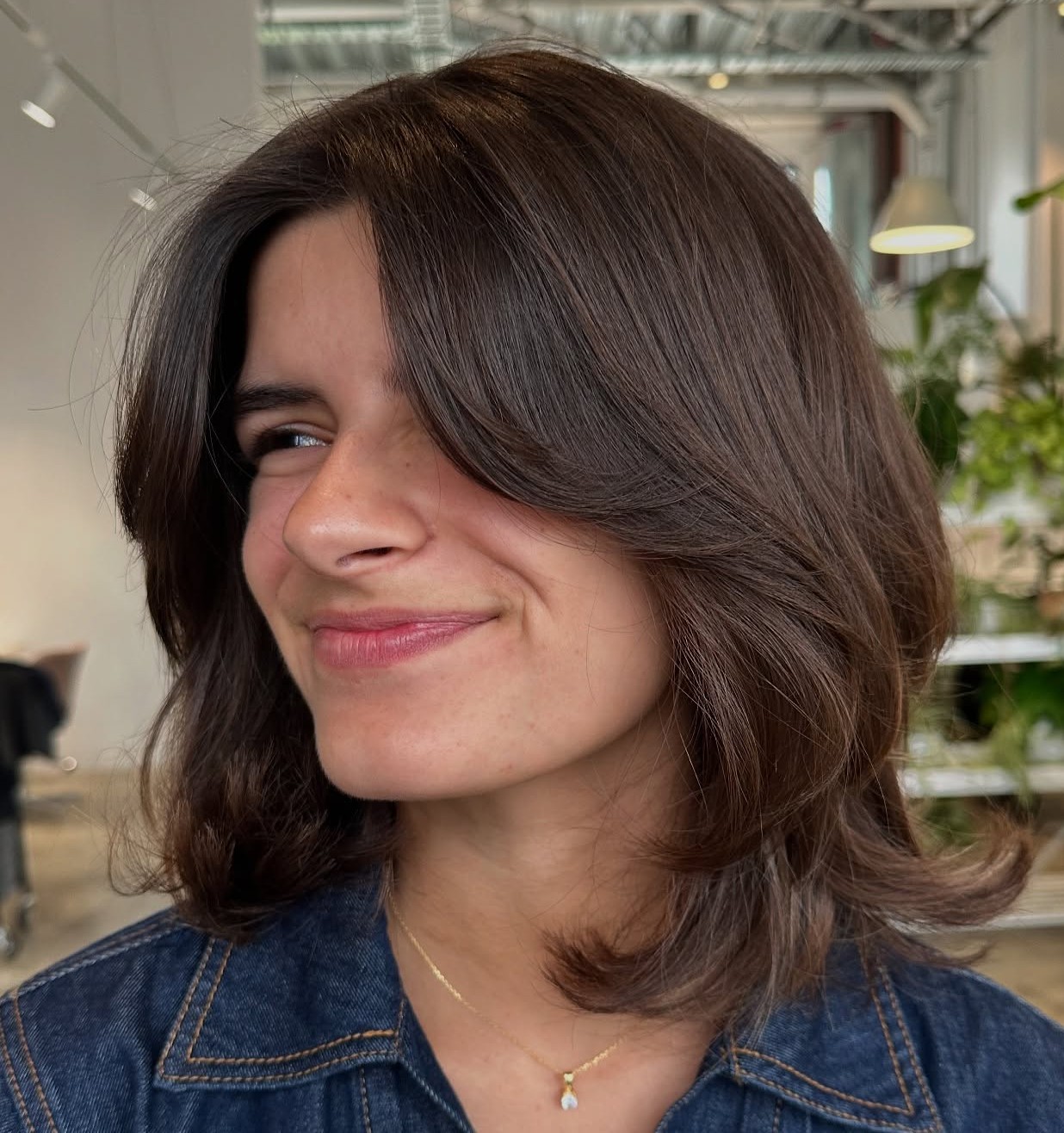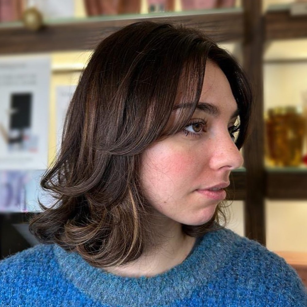 You’ll notice the shorter layers that fall at the cheekbone level and the side sweep that creates a faux angled bang. Both details are perfect to loosely frame the face. Remember that the more layers, the more volume, making thin hair the ideal candidate for such a cut.