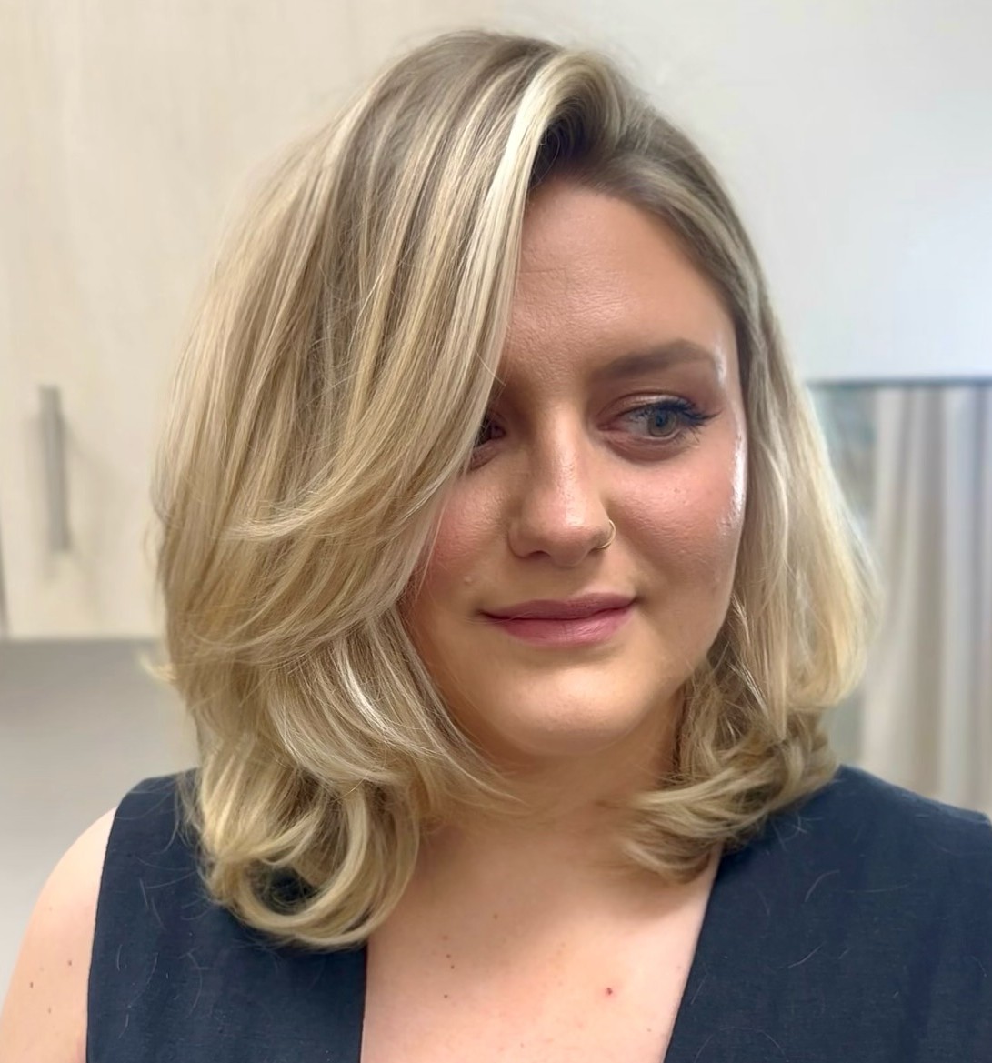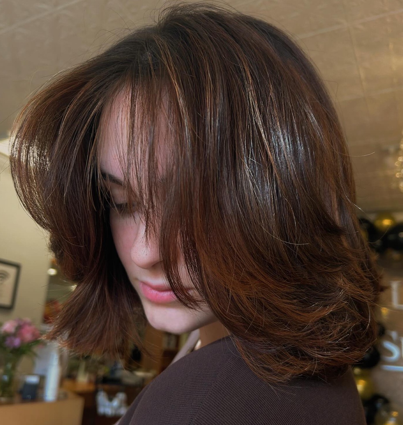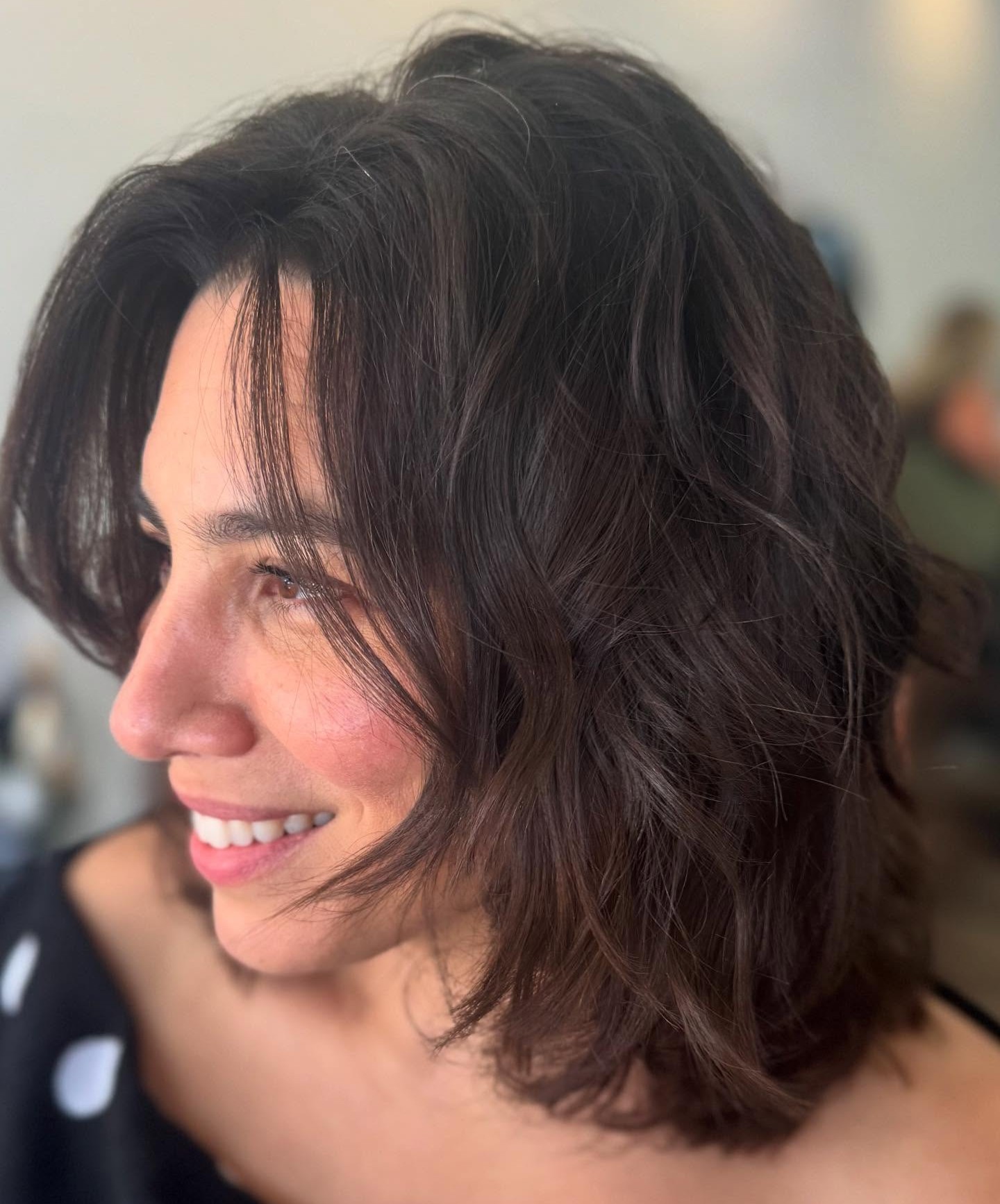 If you’re a volume junky, a deep side part will be your best friend. A light curl and lifting spray will help you achieve this glam style. The chunky layers help balance the boost for a full shape all the way around.